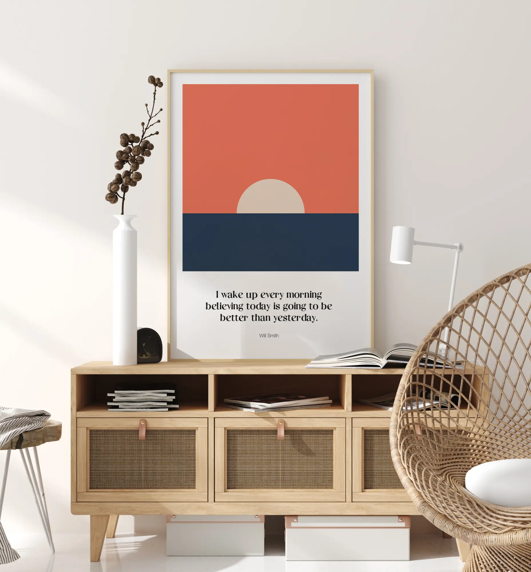 Un poster avec une citation de Will Smith "Je me réveille chaque matin en croyant que aujourd'hui sera meilleur qu'hier" écrite sous une illustration graphique d'un lever de soleil. Un poster élégant et épuré créé par Tim Hansson.