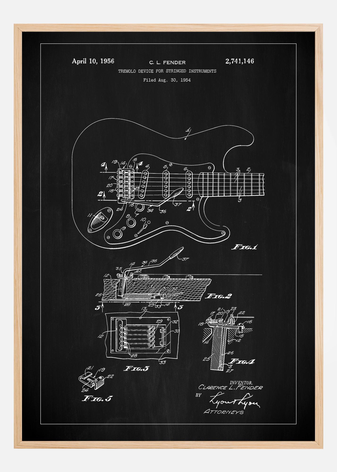 Plongez dans l'harmonie de la musique et de la technologie avec cette affiche iconique sur le brevet de C. L. Fender pour un système de tremolo innovant pour instruments à cordes, brevet numéro 2,741,146 accordé le 10 avril 1956. Cette élégante affiche en noir et blanc, présentant des croquis et des descriptions détaillés, offre non seulement un aperçu historique de la conception de guitare mais ajoute également une touche esthétique à tout espace dédié à la musique et à la créativité.