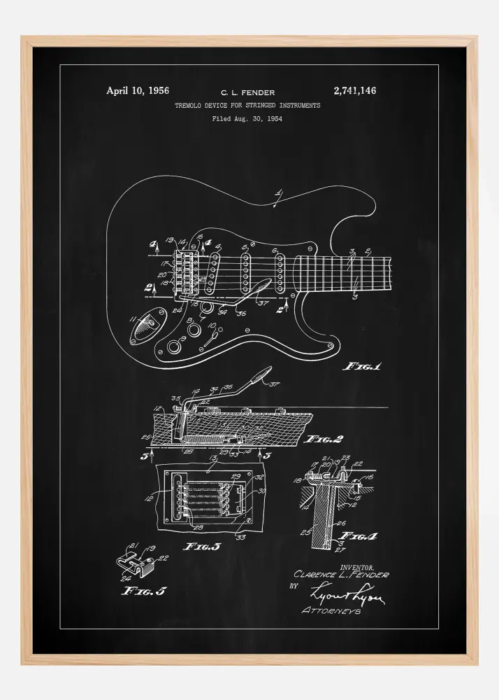 Plongez dans l'harmonie de la musique et de la technologie avec cette affiche brevetée iconique présentant le système de trémolo innovant pour instruments à cordes de C. L. Fender, accordé par le brevet numéro 2,741,146 le 10 avril 1956. Cette élégante affiche en noir et blanc, qui montre des croquis détaillés et des descriptions, offre non seulement un aperçu historique de la conception de la guitare, mais ajoute également une touche esthétique à tous les espaces dédiés à la musique et à la créativité.