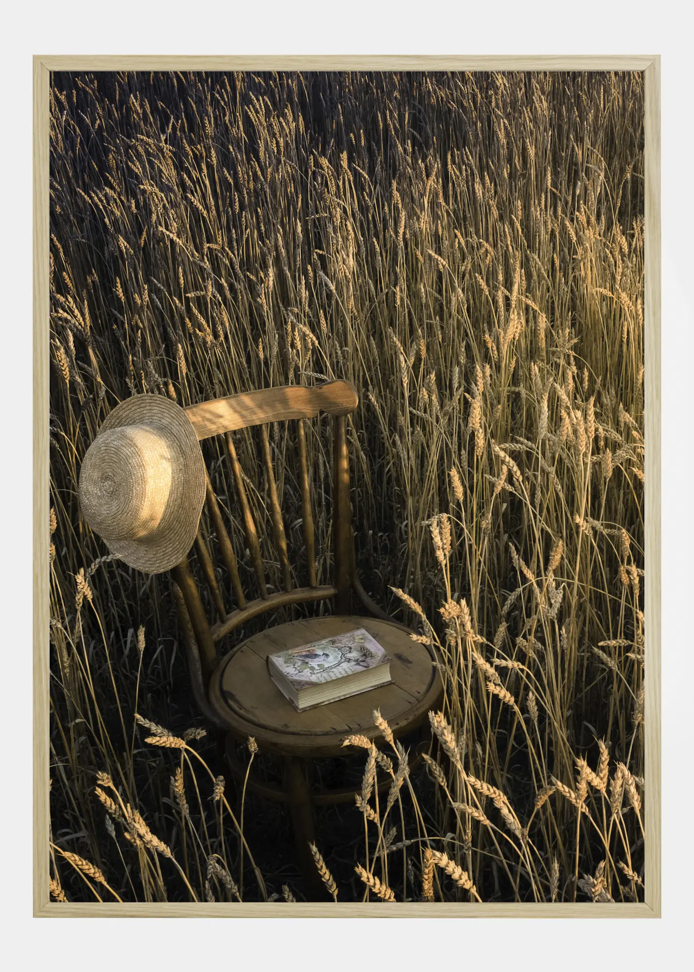 Une affiche dorée d'un champ de blé sous le soleil. Au milieu du champ se trouve une chaise en bois isolée. Un chapeau de paille et un livre sont posés aussi sur la chaise dans cette lumière dorée. N'oubliez pas de prendre à côté du temps libre et de trouver votre propre coin de calme et de tranquillité.