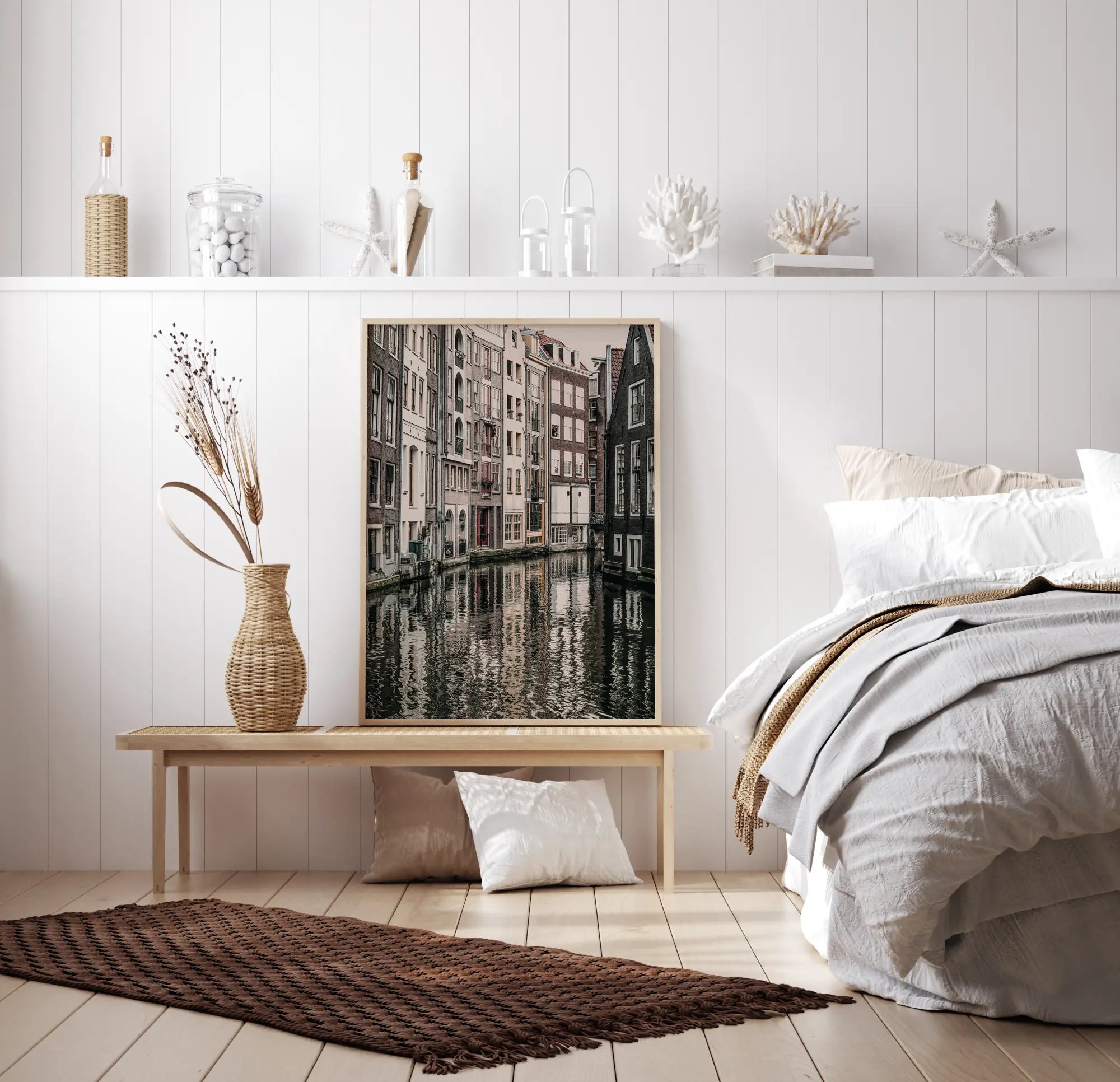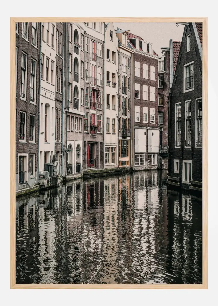 C’est une affiche de ville représentant un canal traversant des rangées de grandes maisons. Cette impression sépia ne comporte que quelques nuances de rouges et de bruns doux pour créer des points focaux. Les maisons sont posées au bord de l'eau. Elles projettent leurs ombres sur la surface ondulée. Trouvez des beiges assortis pour votre mur afin de rendre les couleurs des maisons plus nettes.