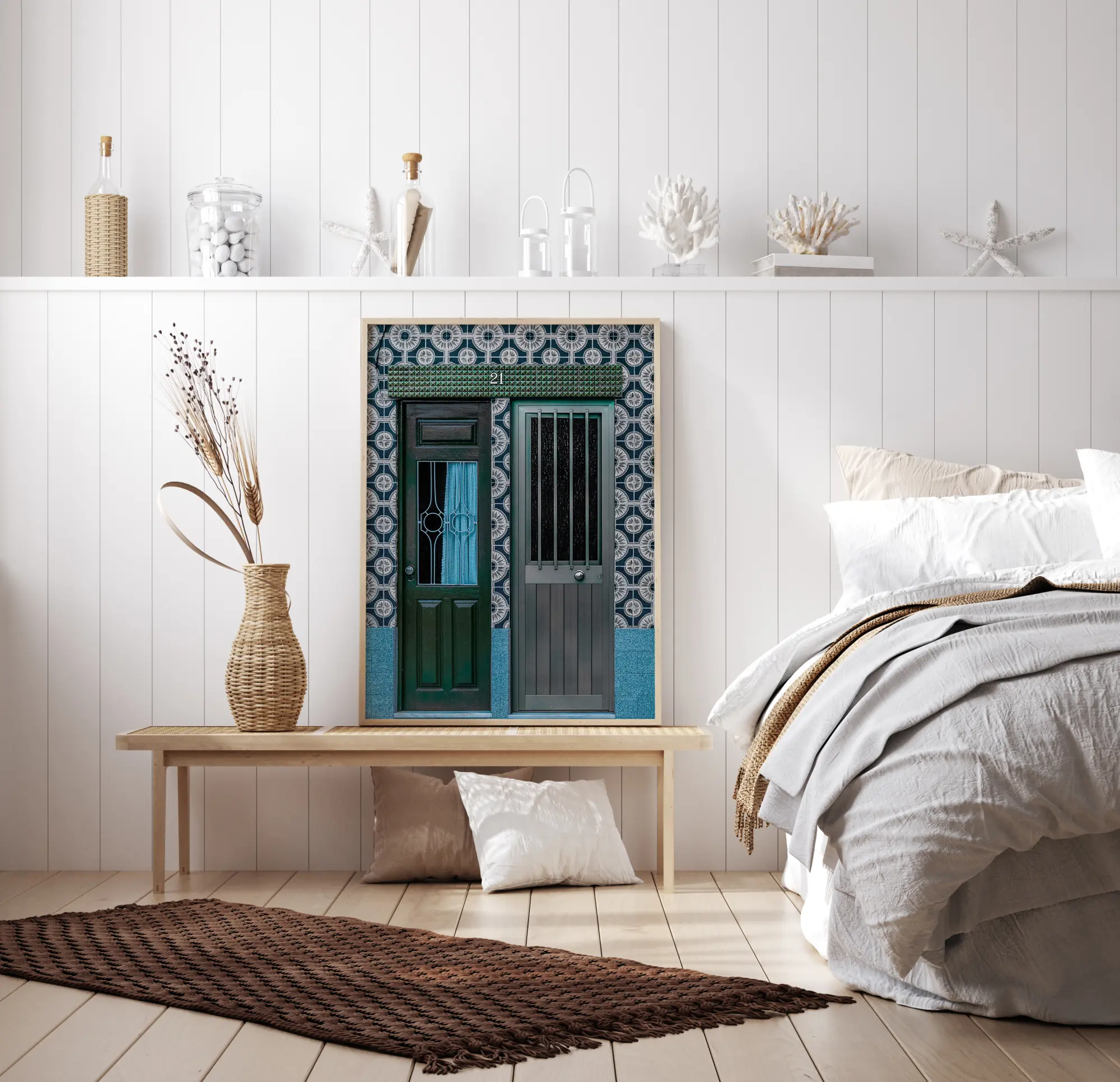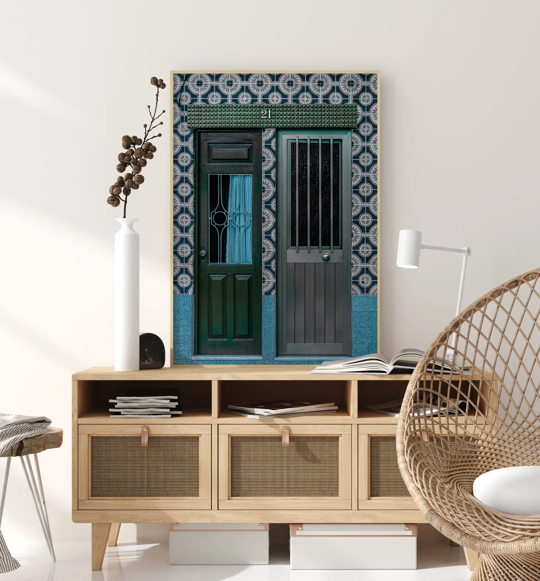 Une affiche d'intérieur montrant deux portes l'une à côté de l'autre accrochée à un mur carrelé bleu vif. Chaque porte est dotée d'un design différent, l'une verte, l'autre grise. Elles sont toutes deux placées sous le signe 21. Se rendent-elles dans la même maison ou dans des endroits différents ? Apportez cet objet chez vous et laissez votre imagination faire le reste.