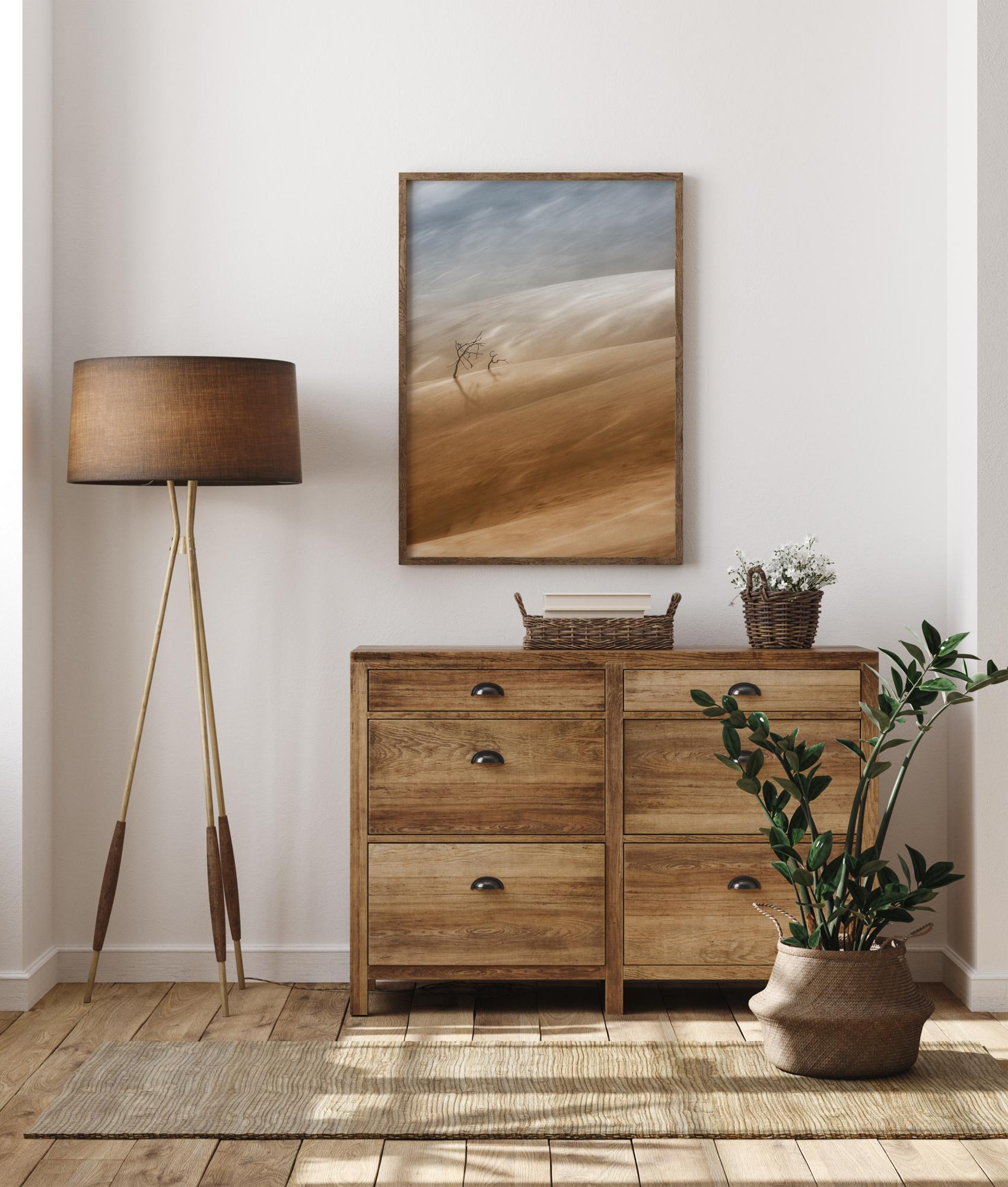 Une affiche avec vue panoramique du désert avec deux arbres isolés. Les jaunes et bleus pastel créent une vision harmonieuse qui ira dans n'importe quelle pièce de la maison. Laissez-vous emporter par cette scène étonnante.