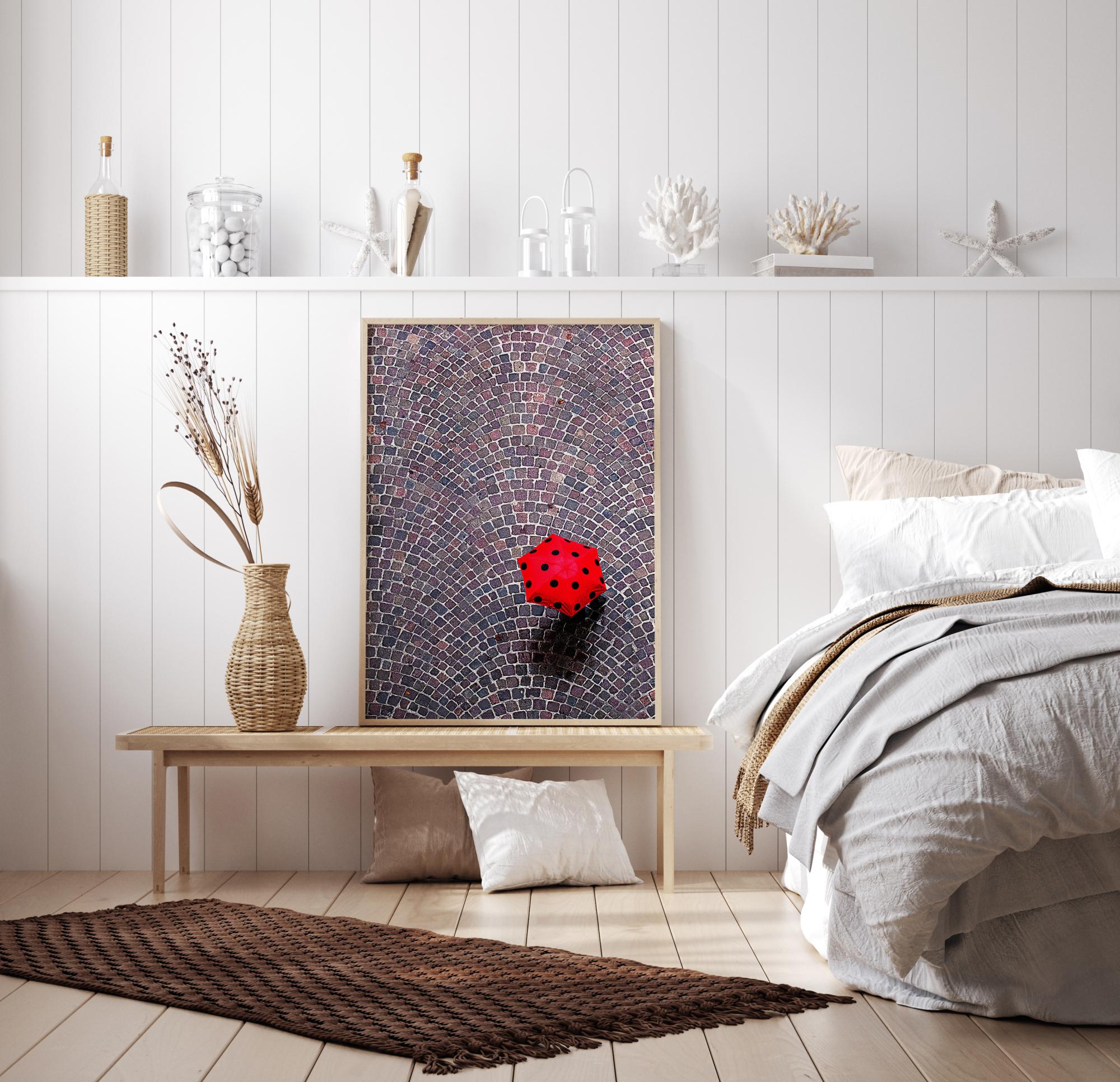 Une affiche urbaine d'un trottoir avec vue plongeante. Un parapluie rouge vif avec des taches noires crée un point lumineux dans le sol en mosaïque bleu et violet. Ce parapluie coccinelle crée un point focal amusant dans cette image à motifs et en forme de tesselles.
