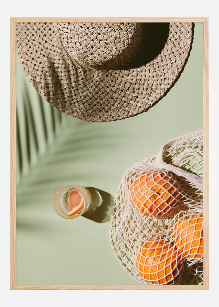 Cette affiche délicieusement estivale capture l'essence de l'ambiance de vacances avec son imagerie détendue et rafraîchissante. Un chapeau de soleil tressé et un filet rempli d'oranges mûries au soleil sur un fond de tons verts apaisants transmettent instantanément la sensation de journées paresseuses au soleil. L'image évoque une association immédiate avec des climats chauds, des fruits frais et un temps de détente. C'est un excellent choix pour tous ceux qui souhaitent apporter un peu de cette agréable sensation de vacances dans leur maison ou sur leur lieu de travail.