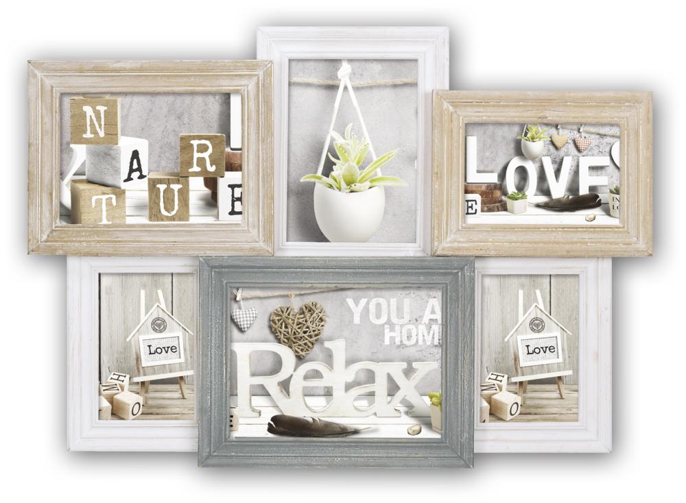 Laissez ce charmant cadre pêle-mêle ajouter une sensation naturelle et décontractée à votre maison ! Le cadre peut accueillir 6 images de différents formats. Les bordures sont de couleur bois, gris et blanc avec des détails passés.