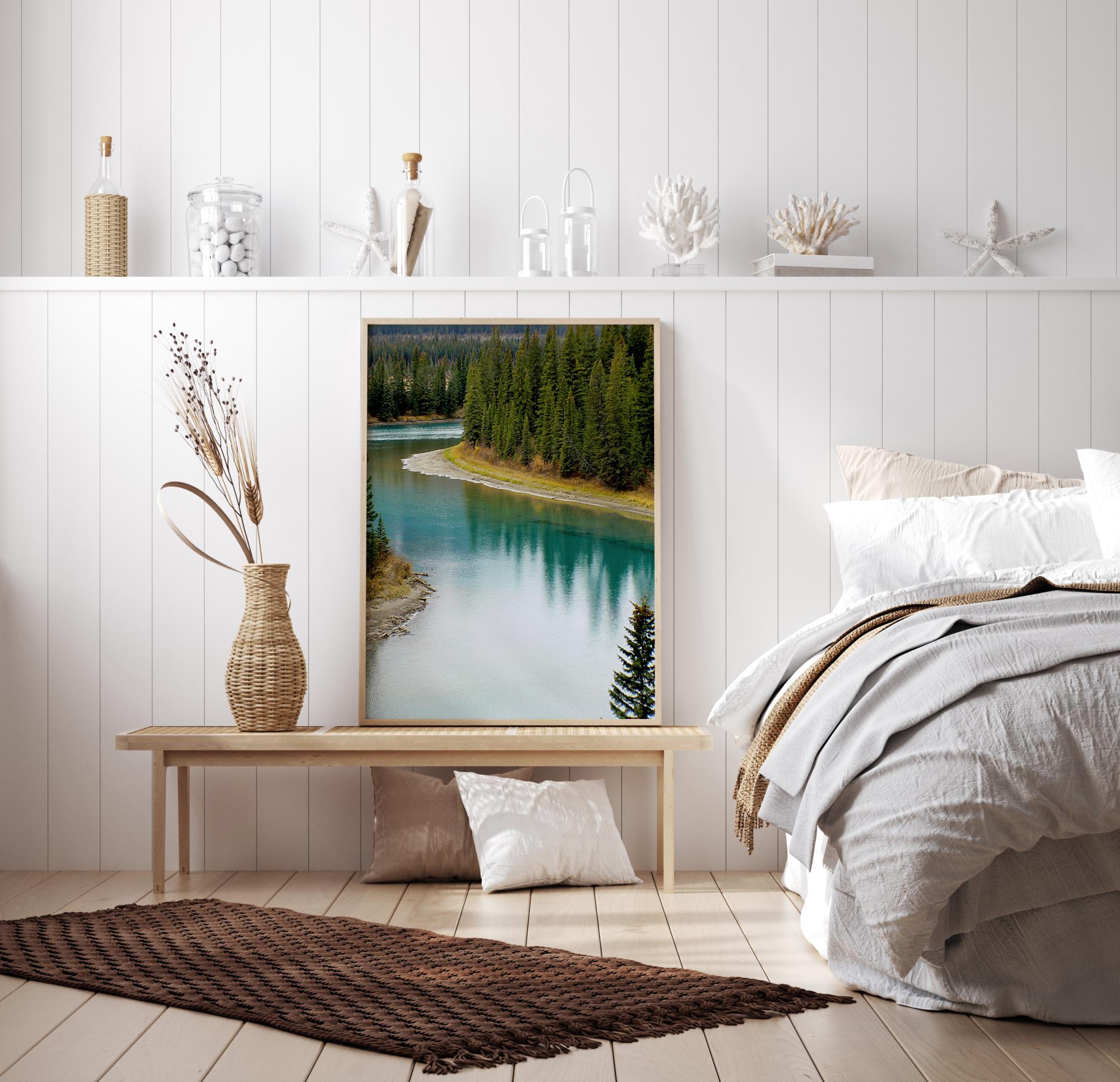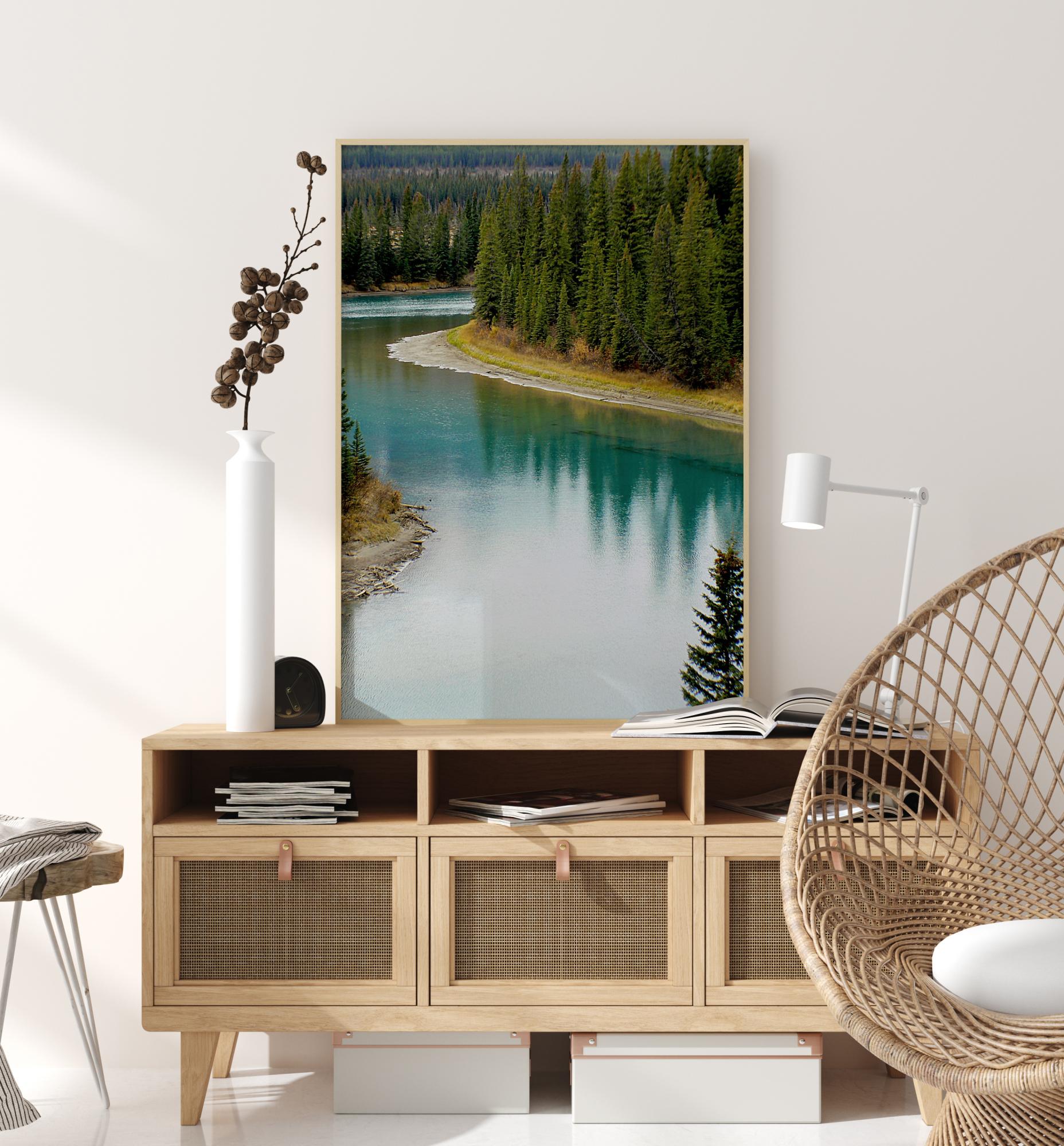 Une affiche mettant en scène une forêt où des sapins bordent les rives d'une large rivière qui serpente à travers la campagne. Les arbres verts sont grands et la forêt s'étend au loin. La large rivière a une teinte presque arc-en-ciel et capture les reflets pointus des arbres sur sa surface.