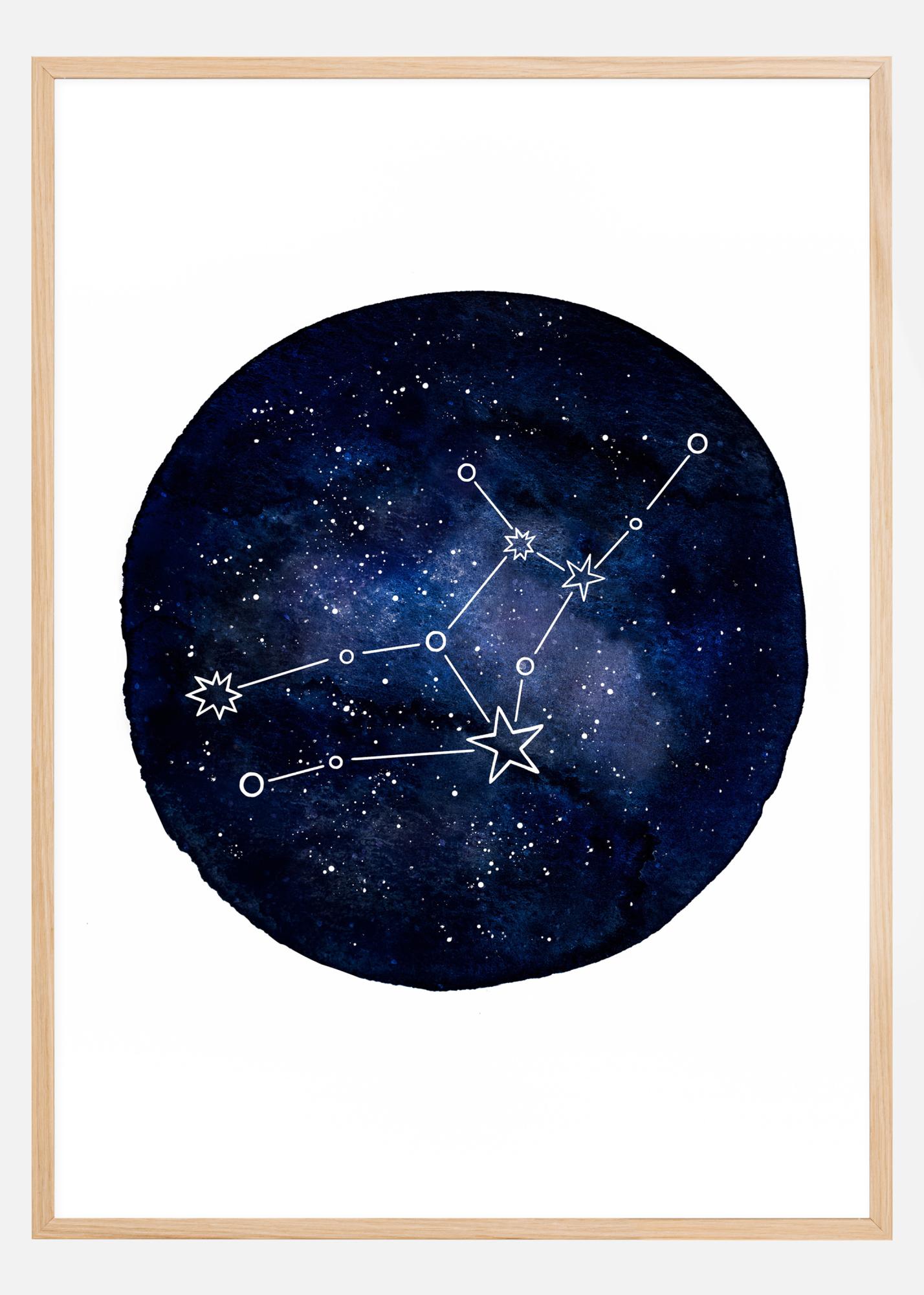 Une affiche du signe astrologique de la Vierge. Des cercles de différentes formes et couleurs remplissent le fond blanc. Chacun est relié par une ligne droite pour créer la constellation de la Vierge. Les dates de ce signe astrologique sont indiquées sous l'image pour vous le rappeler.