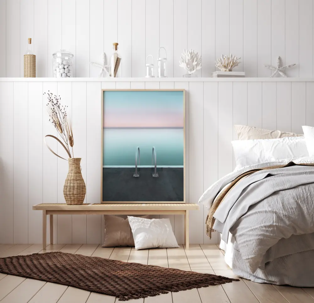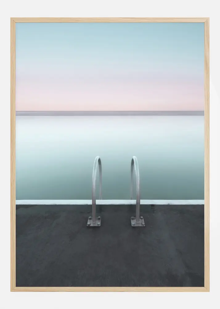 Un poster pastel de poignées d'échelles de piscine menant au bord d'une plate-forme dans une vaste mer de bleu. Les poignées sont séduisantes et vous encouragent à les suivre au-dessus du bord, dans l'étendue d'eau cristalline. Un ciel rose pâle est visible à l'arrière-plan dans la lumière matinale.