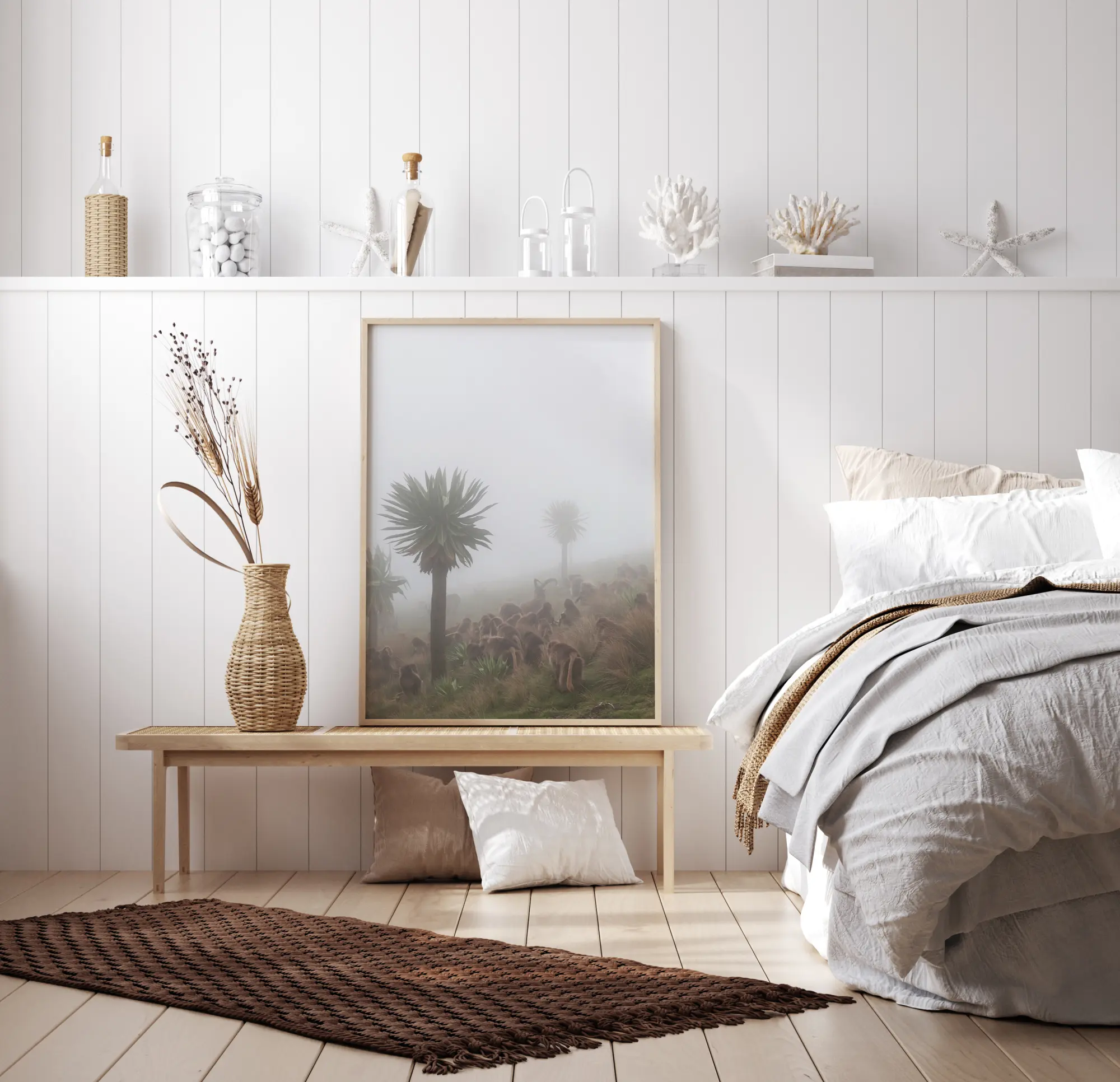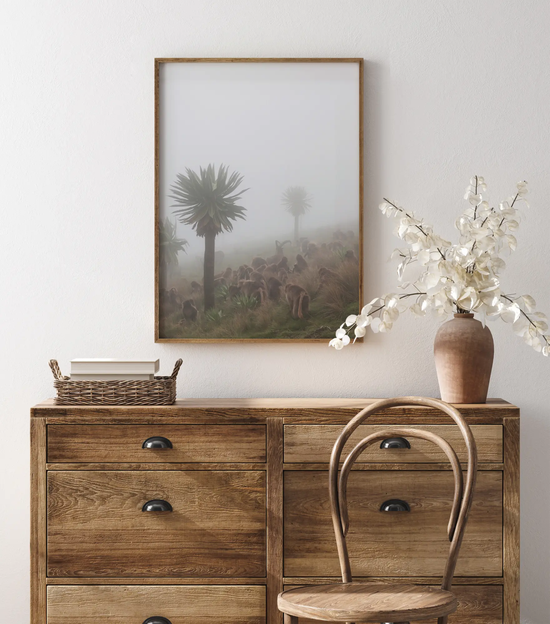 Ce poster animalier représente une troupe de geladas avec un bouquetin au milieu d'eux. Ce groupe d'animaux est assis sur un flanc de colline brumeux où s'élèvent divers arbres. La scène est calme et tranquille alors que ces animaux prennent un moment pour se reposer de la journée.