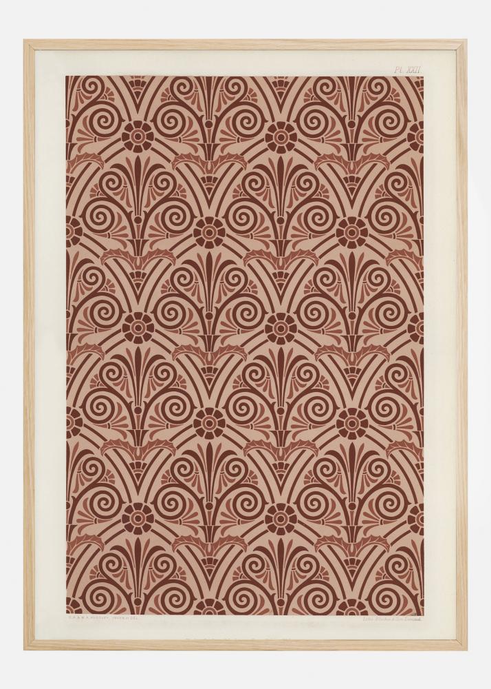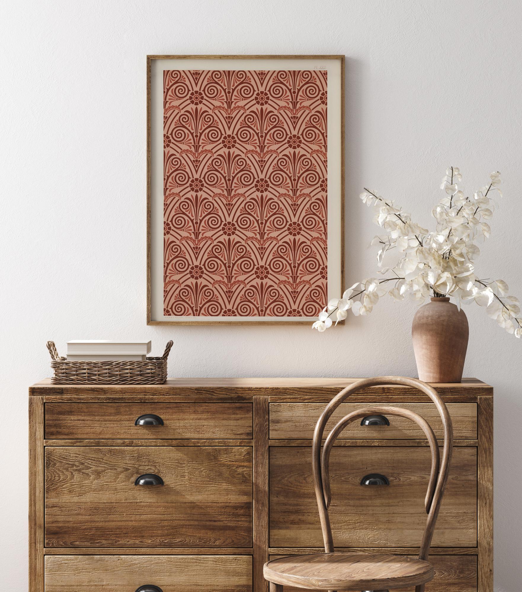 Une affiche aux motifs lumineux et répétitifs de couleur rouge. Au sein de ces motifs, des cercles ondulés ressemblent à des feuilles ou à des frondes. Il y a également des formes de fleurs par intervalles. Ce qui en fait un motif botanique. Il est parfait pour créer du papier peint. Admirez les images que vous voyez dans ces motifs complexes.