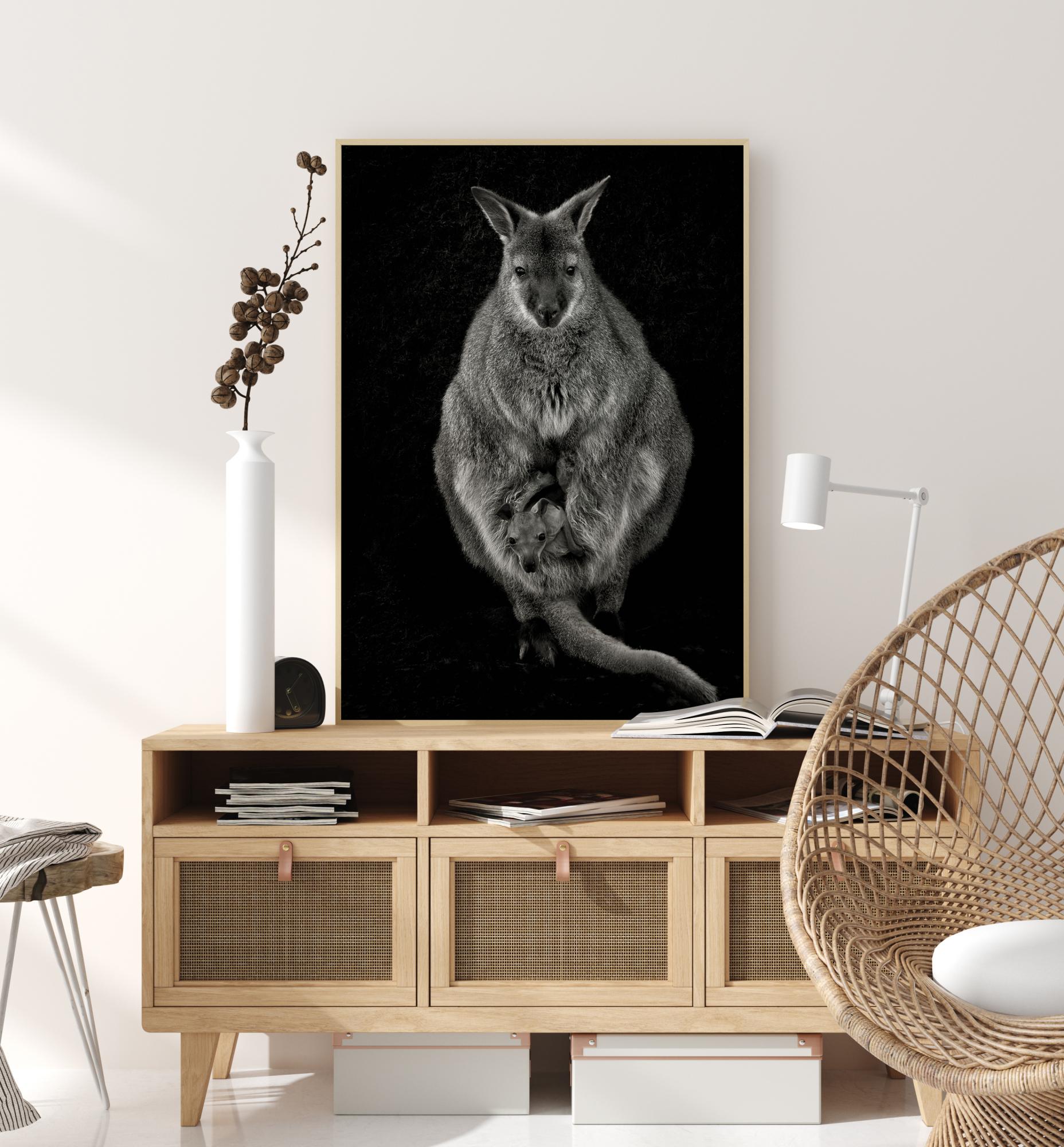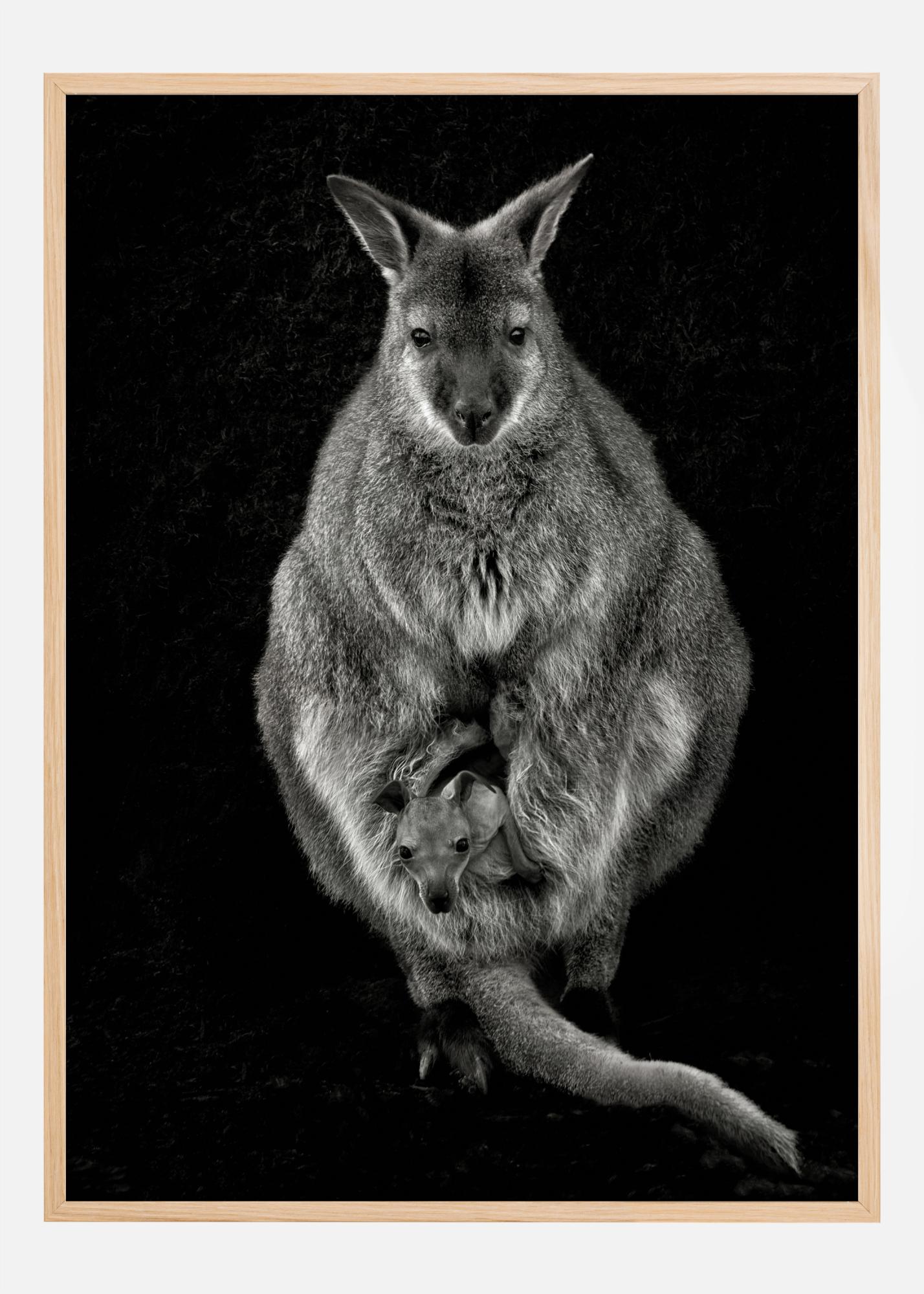 Une affiche sur la nature représentant un wallaby et son bébé. Le couple se démarque sur cette photo étonnante sur fond noir. Vous ressentirez un sentiment de douceur en regardant cette maman et son enfant.