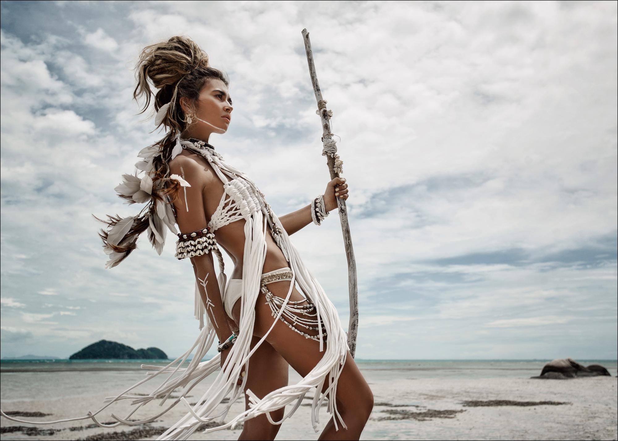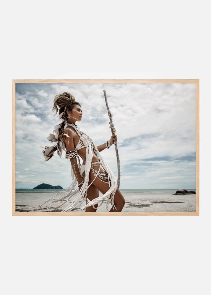 Un poster de guerrier d'une jeune femme posant sur une plage. Elle est habillée de vêtements tribaux légers. Sa peau bronzée contraste avec les vêtements blancs fluides et les bijoux qui couvrent son corps. Ils s'entremêlent dans ses cheveux. Sa pose puissante est renforcée par la longue perche qu'elle tient dans sa main gauche et qui lui permet de fixer ses ennemis.