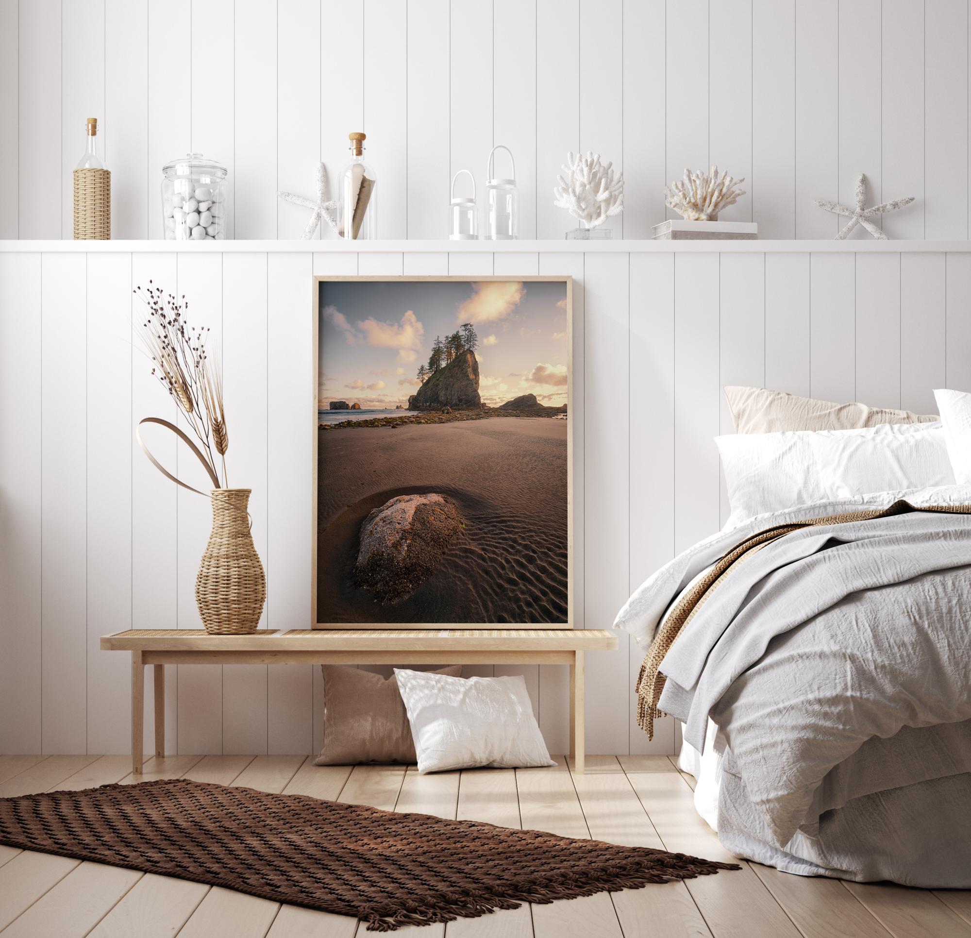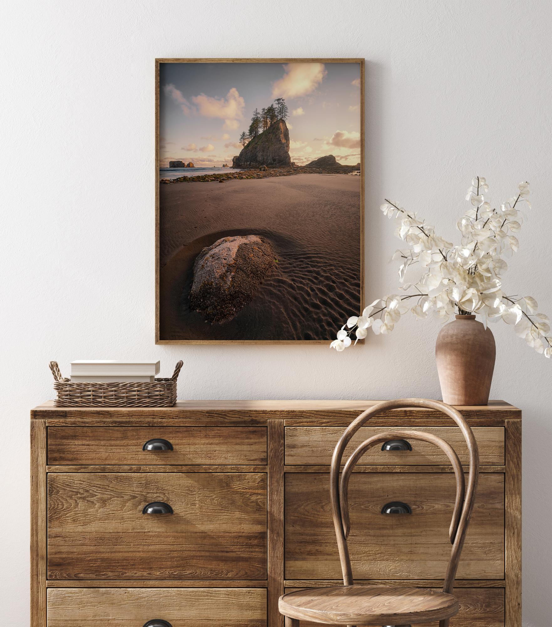 Une affiche scénique d'un gros plan d’une plage. L'angle bas permet de s'approcher du sable et de suivre les traces d'eau créées à partir d'un bassin rocheux. Au loin, un rocher recouvert d'arbres émerge de la mer dans un ciel azuré tendre rempli de nuages blancs cotonneux.
