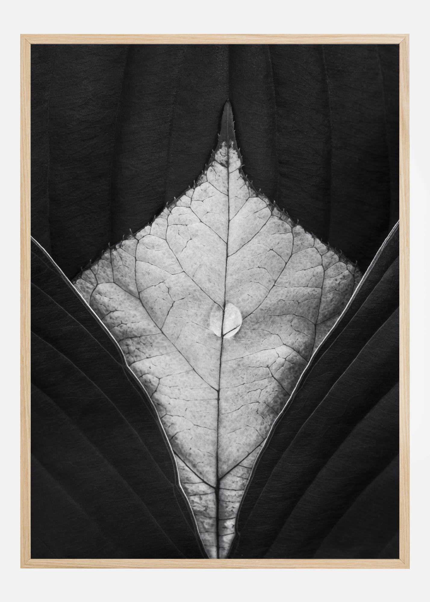 Une affiche nature en gros plan d'une goutte d'eau sur des feuilles. La prise de vue macro des feuilles vous permet de voir ce que vous voulez dans cette photo légèrement abstraite. Plongez dedans depuis le confort de votre maison en l’affichant sur un mur.