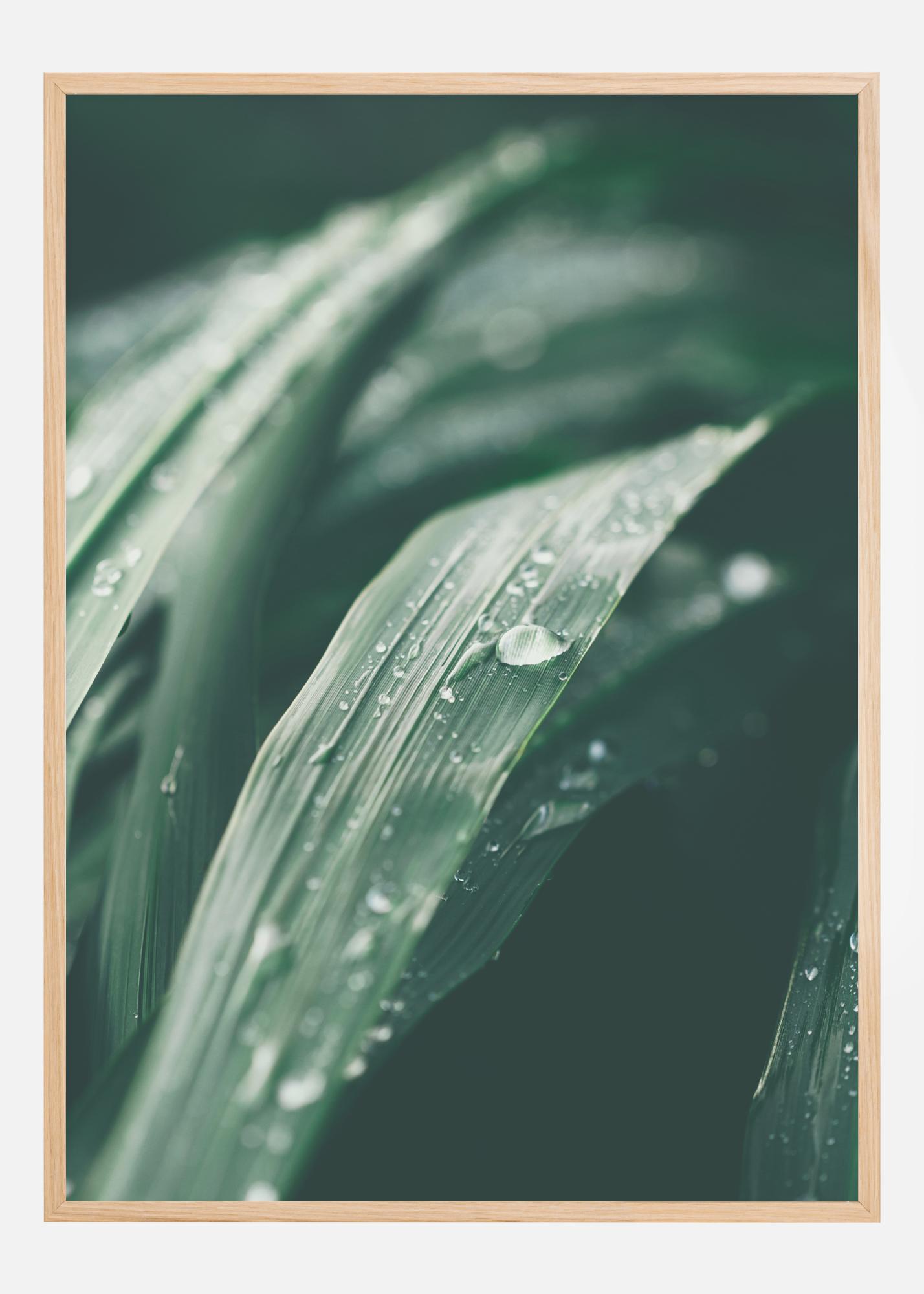 Une affiche macro de feuilles avec une rosée matinale. Les feuilles vertes foncées remplissent l'image avec leurs veines bien détaillées. Les gouttes d'eau suivent les courbes des feuilles et s'écoulent vers les bords de l'image. Ajoutez cette image à un mur de couleur terreuse pour créer une ambiance forestière.