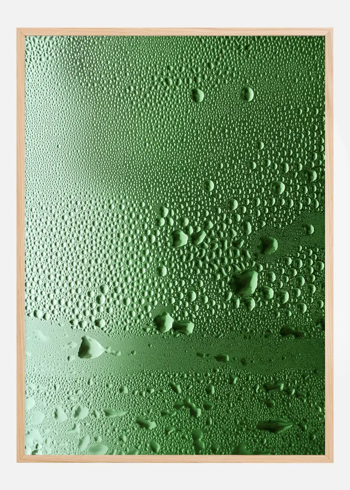 Redécouvrez la beauté simple des éléments de la nature avec notre affiche qui met en avant la fraîcheur des gouttes d'eau sur une surface brillante. Cette œuvre d'art capture le moment où les gouttes reposent tranquillement sur un fond vert vif, chacune reflétant la lumière et ajoutant profondeur et texture à la composition simple. Cette impression est un rappel subtil des nécessités pures de la vie et de la présence tranquille de la nature.