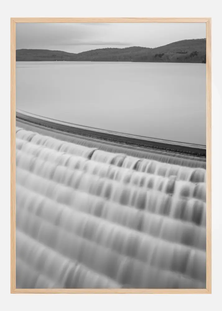 Un poster gris mettant en avant des mini-cascades dans un barrage artificiel près d'un lac. Les eaux grises immobiles s'étendent suivant les minuscules chutes d'eau qui ruissellent sur les petits rebords. Elles créent un motif en mouvement et de déplacement. Détendez-vous et laissez vos yeux suivre les courants d'eau qui s'écoulent lentement.