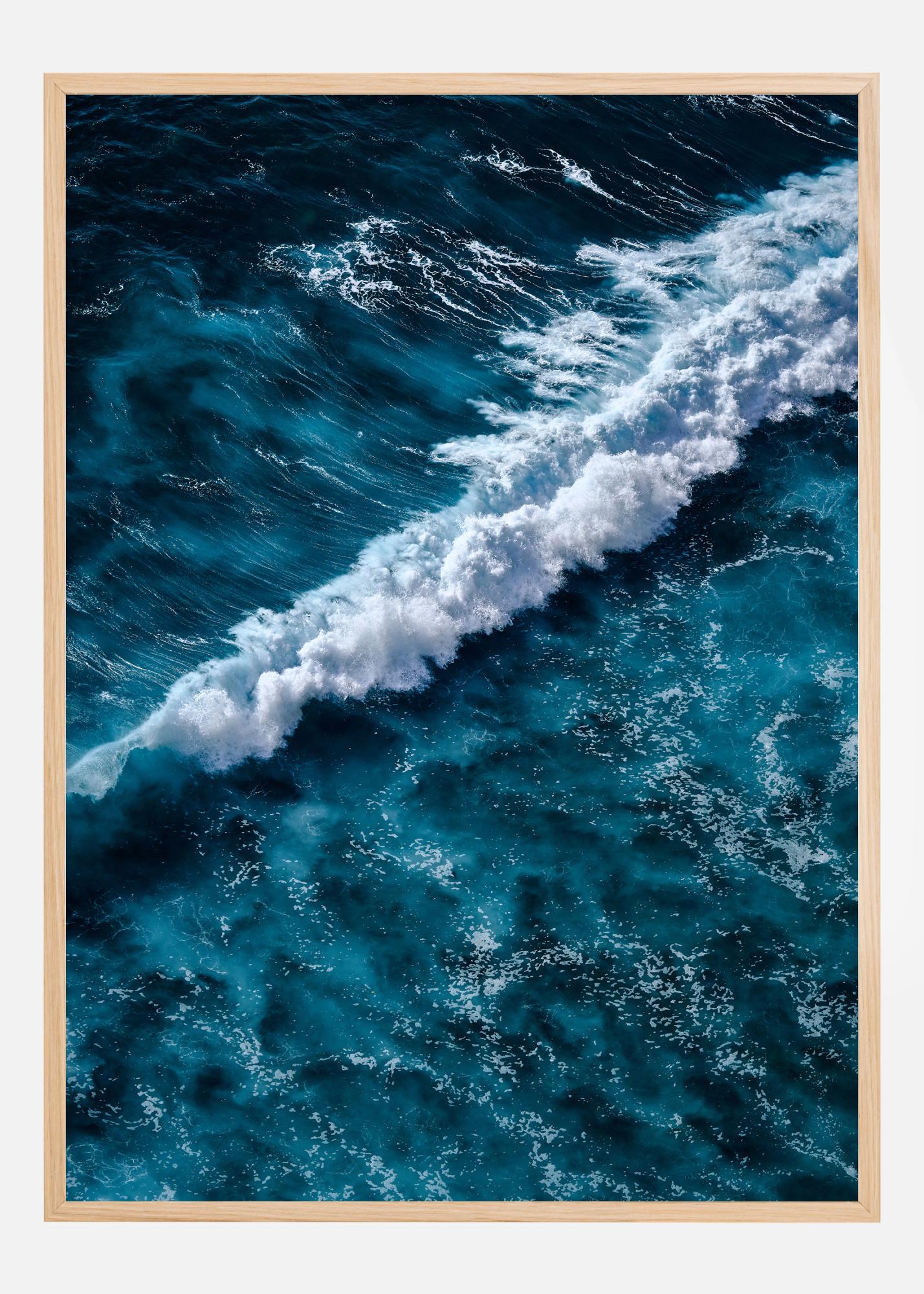 Cette affiche dynamique capture la puissante force de l'océan dans un instantané d'une vague déferlante. Avec des nuances de bleu marine profond et de crêtes d'écume blanche éclatante, le contraste est non seulement frappant mais aussi plein de mouvement et de vie. La surface de la mer, vivante et changeante, captive l'œil du spectateur et le guide à travers le rythme naturel et la danse de la vague.