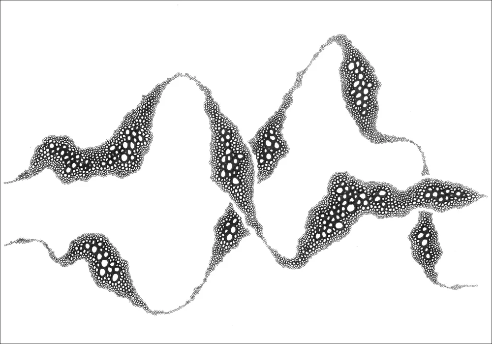 Un poster imaginaire dans un décor dramatique avec différents cercles noirs et blancs. Les formes créent d'étranges vagues ondulantes sur un fond blanc. Il y a de grands et de petits cercles comme des bulles attachées à de longues cordes ondulantes qui tourbillonnent et se courbent à travers l'image en se croisant les uns les autres dans cette pièce étrangement fascinante.