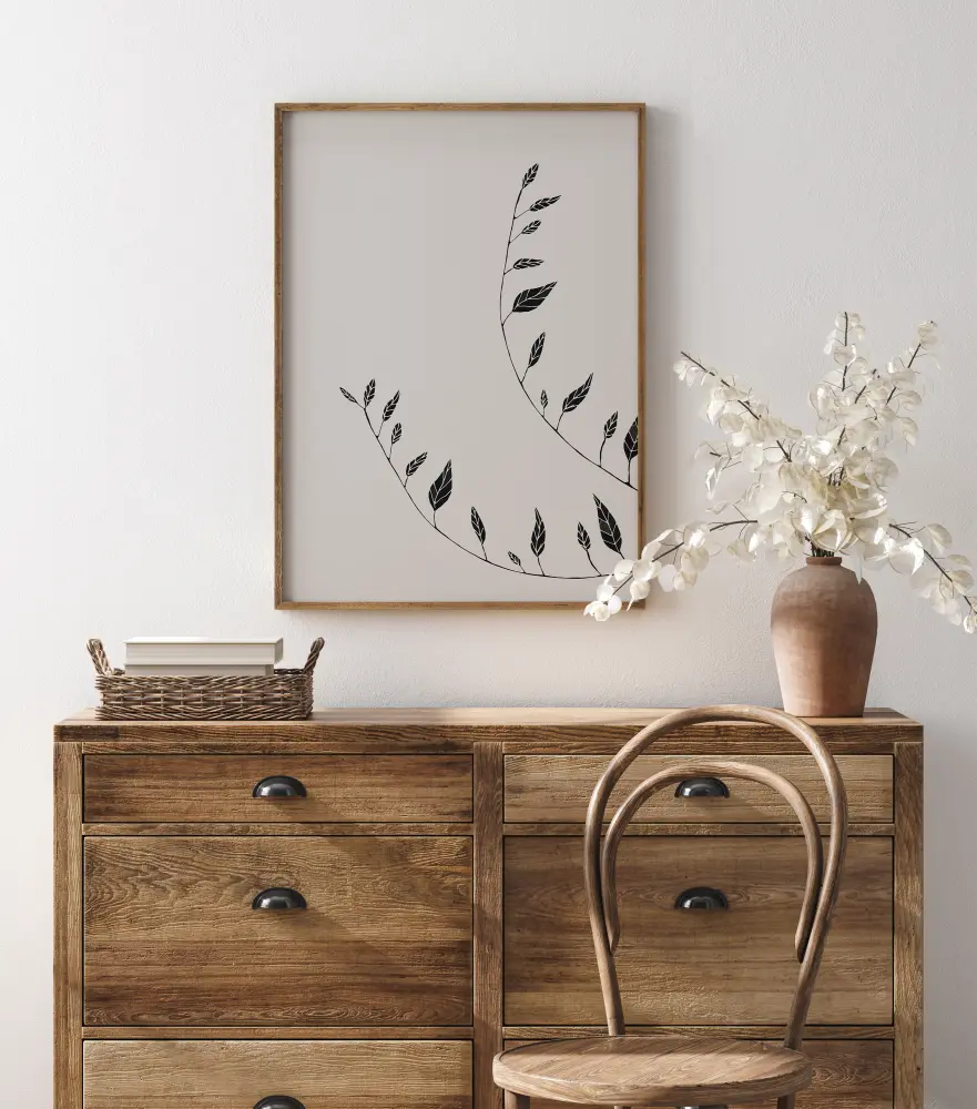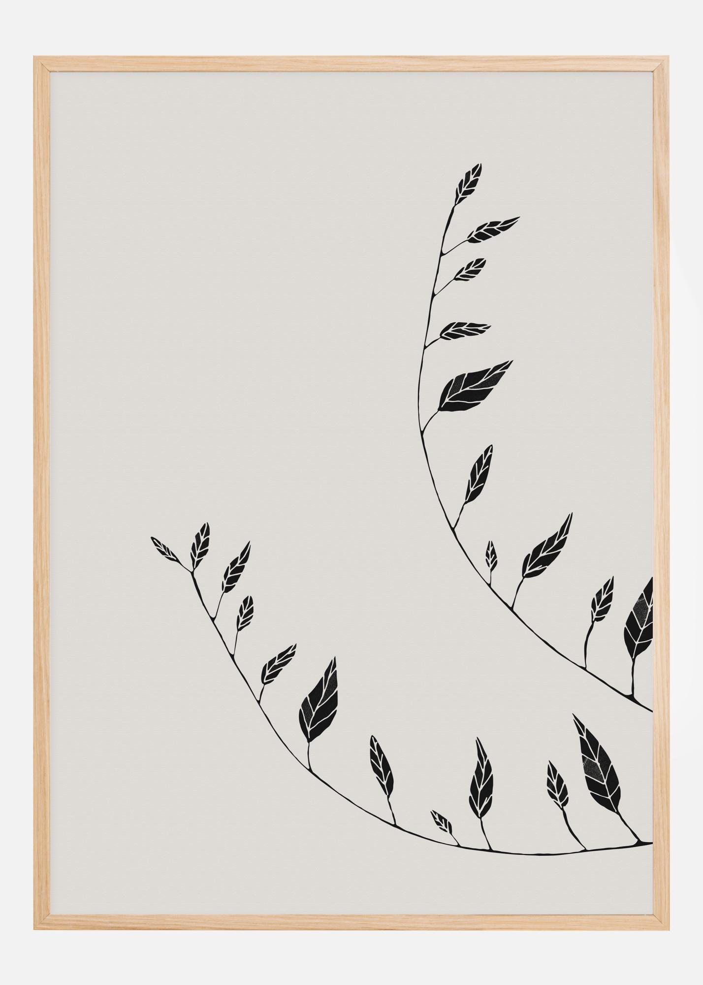 Une affiche en noir et blanc de simples branches et feuilles sur un fond blanc. Deux branches viennent de la droite et se courbent vers le haut de l'affiche. Les feuilles sont toutes orientées vers le haut, d'un côté de chaque branche. Les courbes donnent l'impression que la plante grandit et qu'elle s'élève vers un soleil invisible.