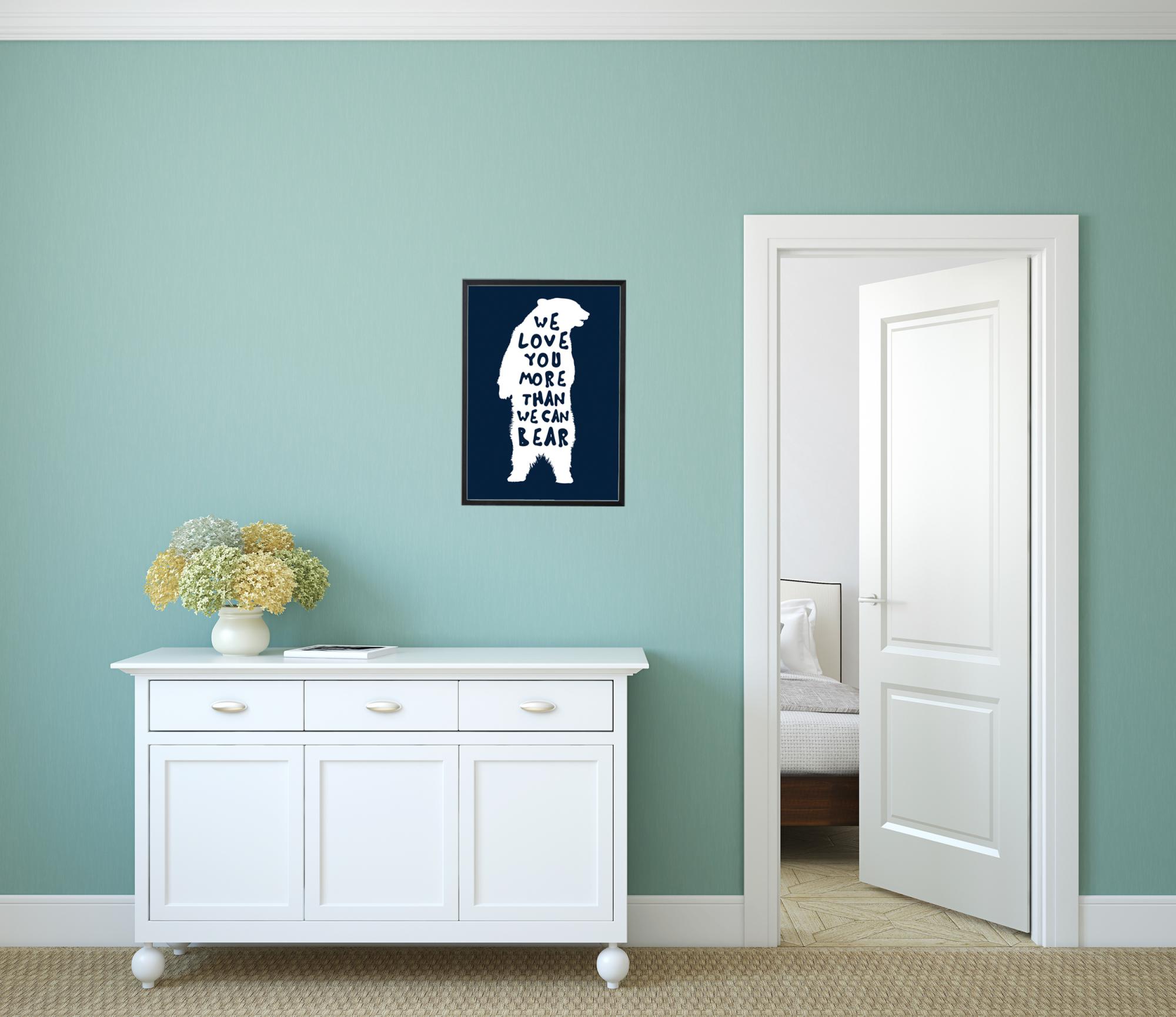 Astucieux et en même temps affectueux poster qui convient à ceux qui aiment particulièrement les ours. L'impression graphique est un beau cadeau à offrir à quelqu'un pour montrer son appréciation. Le poster a une silhouette d'ours en blanc sur un fond sombre et une typographie artistique blanche sur la citation. Encadrez le poster avec un cadre élégant et épuré qui s'intègre dans le reste de la décoration pour créer une sensation d'unité dans l'environnement.