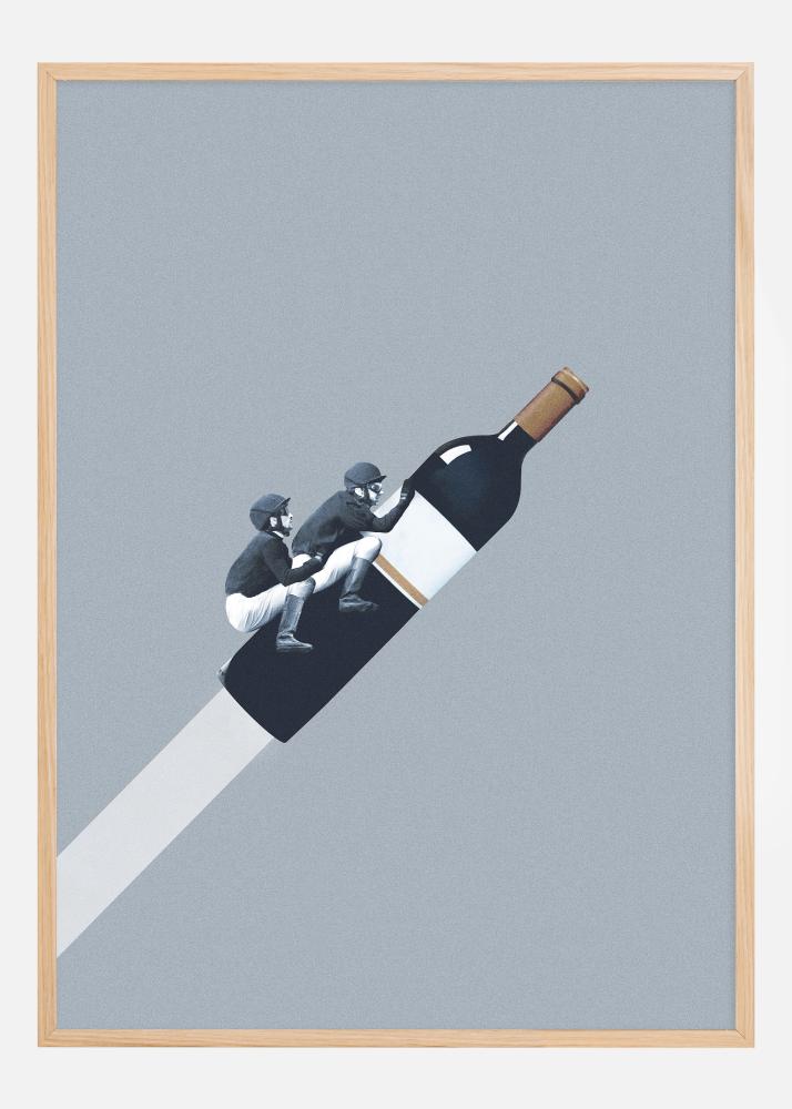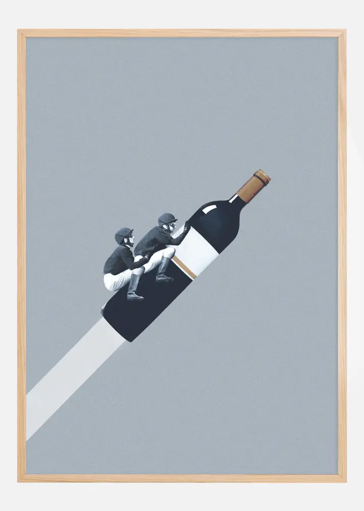 La palette de couleurs est atténuée mais expressive, où les nuances de bleu froid en arrière-plan complètent les tons plus sombres des vêtements d'équitation et le noir profond de la bouteille de vin. Elle combine une esthétique moderne avec un sentiment de nostalgie, ce qui rend cette affiche parfaite pour une touche artistique dans des maisons qui apprécient un mélange de tradition et d'humour. C'est une interprétation contemporaine de sortir de la tempête, offrant une note élégante et en même temps humoristique à n'importe quelle pièce.