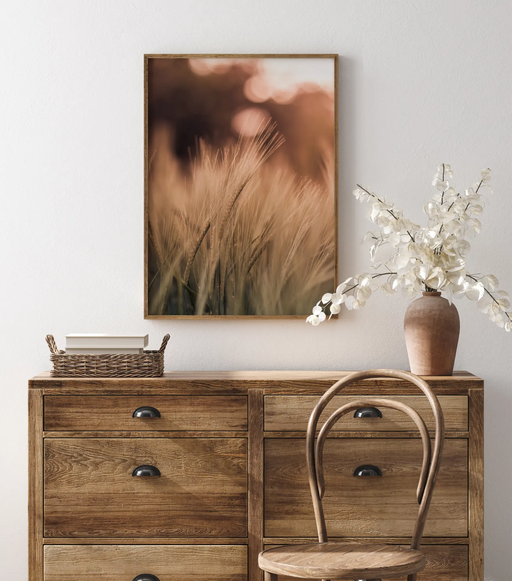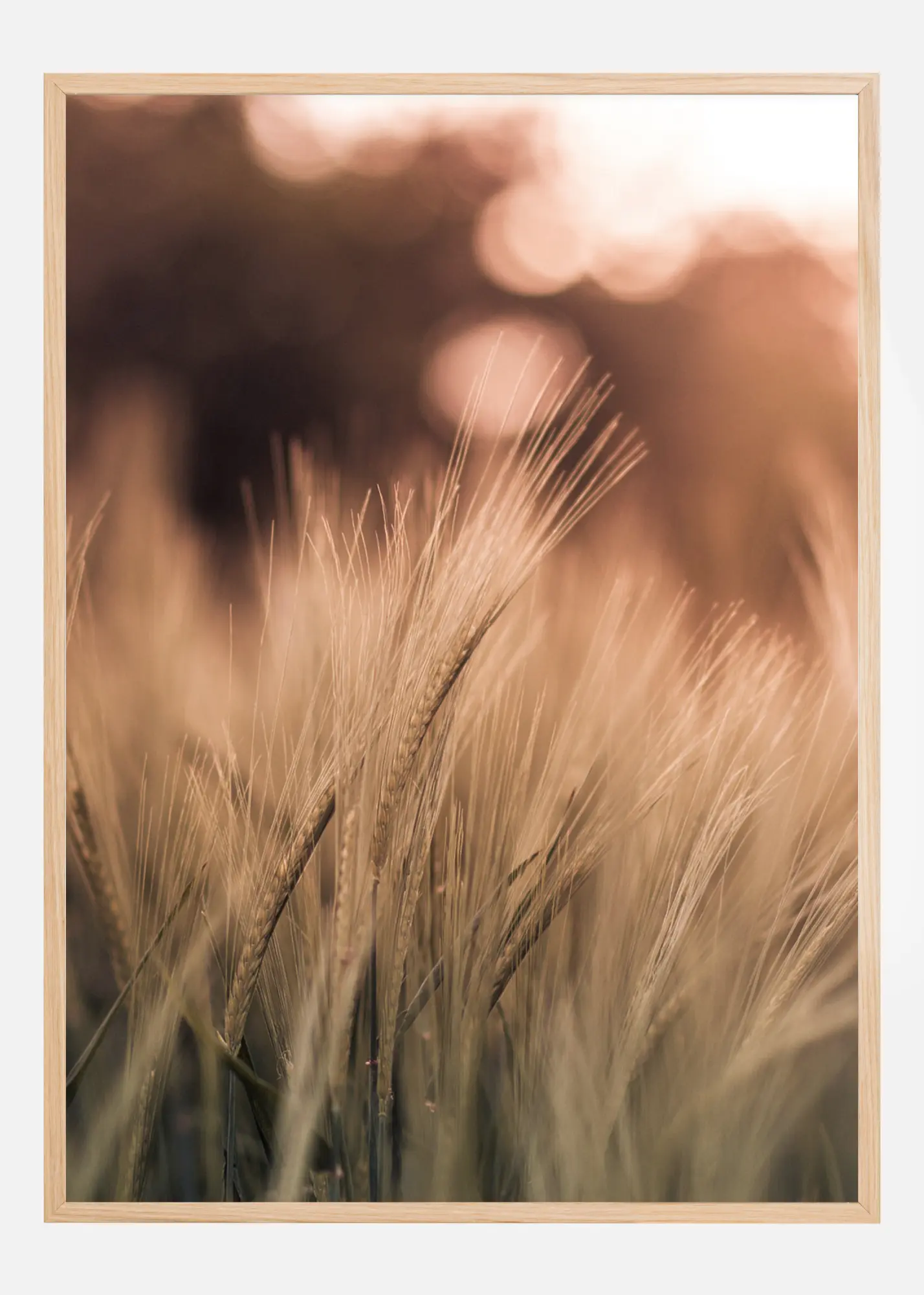 Un poster doux avec d'épis de blé et un soleil de fin d'après-midi. Une douce lumière rose éclaire les épis de blé dorés pour créer une image douce, presque magique. Transformez le banal en quelque chose de beau en ajoutant cette impression à un mur neutre et doux pour créer une ambiance de paix.