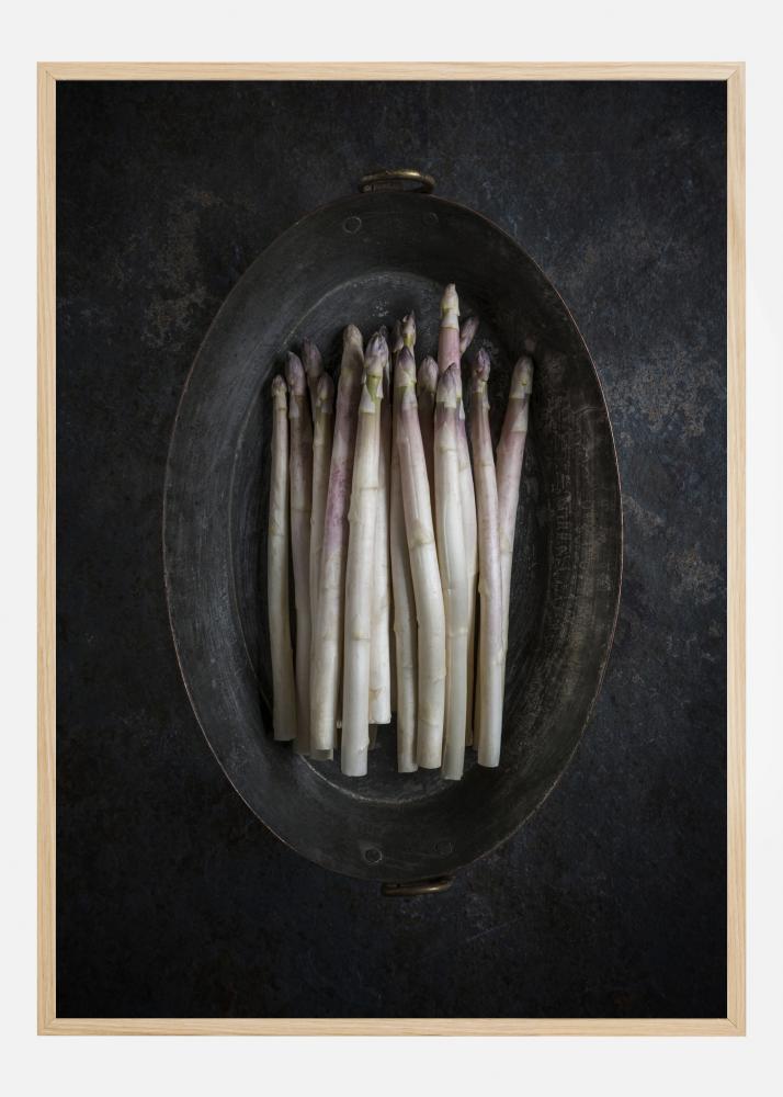 Une affiche sur le thème des légumes avec des asperges blanches posées dans une casserole. Les tiges d'asperges contrastent fortement avec la casserole et le plateau de table noir foncé. Ajoutez cette image dans votre cuisine pour plus d'inspiration lorsque vous cuisinez.