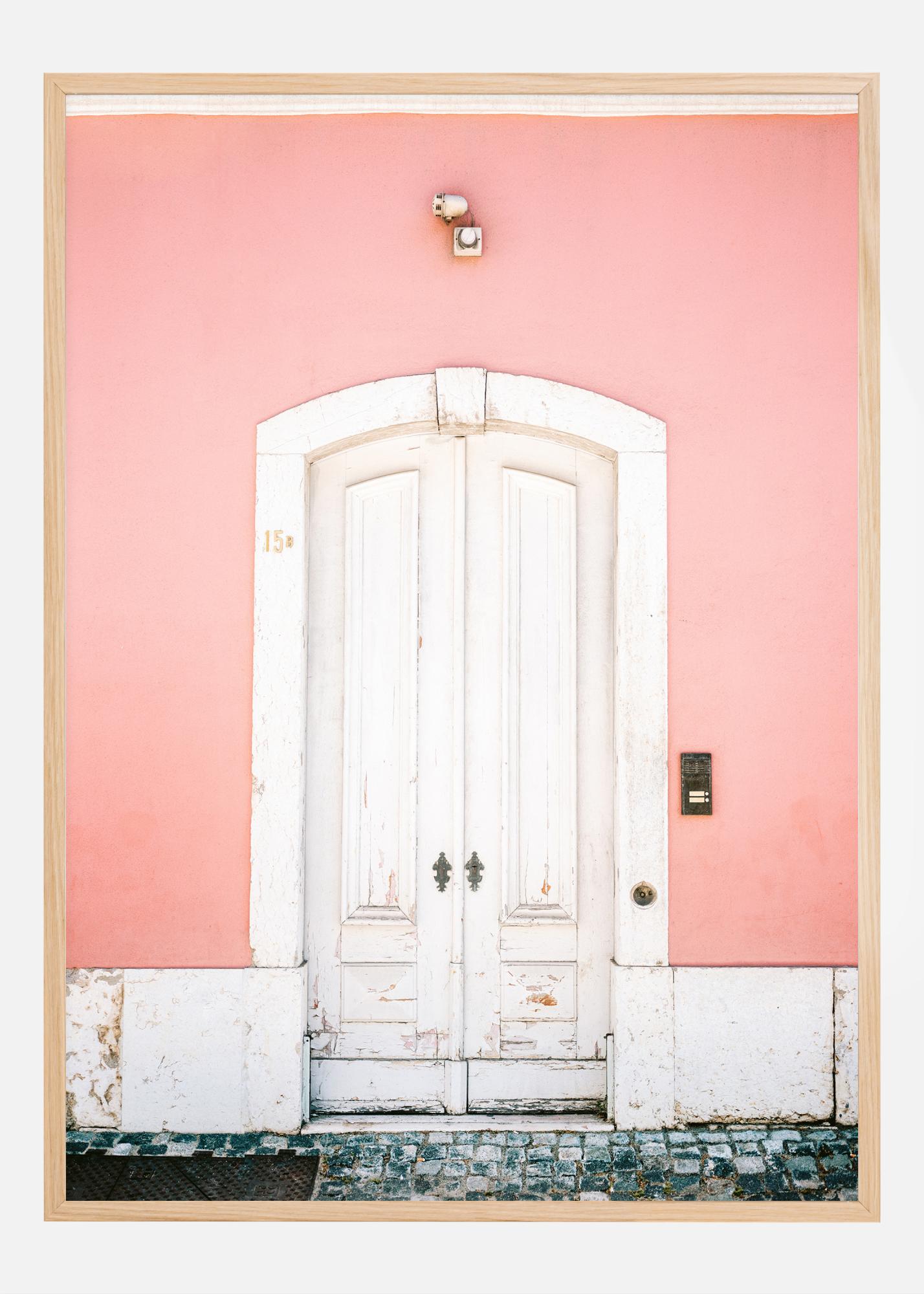 Ce poster présente une belle image d'une porte blanche contre un mur rose doux, une vue qui respire le style décontracté et pourtant élégant si typique de Lisbonne. La surface peinte en blanc de la porte, montrant des signes de patine et de vieillesse, donne une impression d'histoire et de caractère, tandis que les détails en fer noir ajoutent une touche classique. Le numéro de maison "15" est discrètement placé à gauche de la porte, et le trottoir pavé renforce le charme du paysage urbain européen.