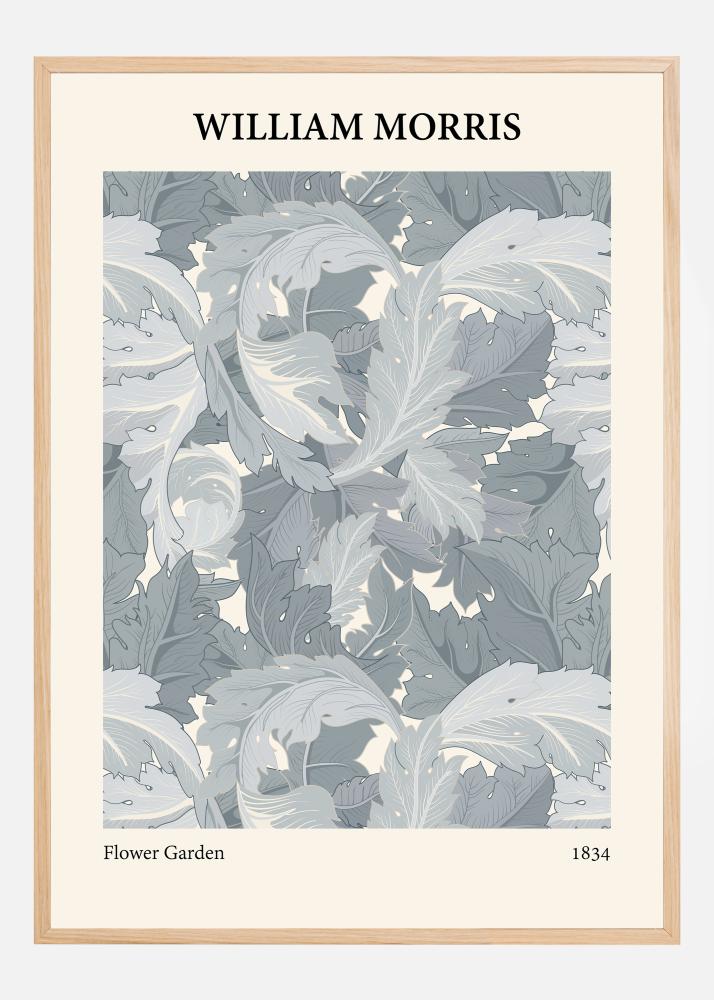 Cette affiche avec son motif luxuriant et sophistiqué de William Morris offre une sensation de calme et d'élégance classique. Le design est une ode à l'abondante verdure souvent associée à Morris et à son travail au sein du mouvement Arts and Crafts. Le motif, appelé "Flower Garden", contient une composition dense de feuilles et de floraisons, présentées dans des tons froids de bleu et de gris avec des touches de crème. Chaque détail de cette affiche est soigneusement pensé, créant une sensation de jardin vertueux et ordonné.