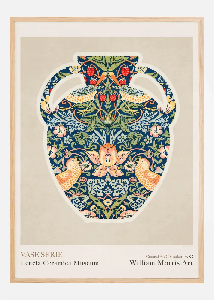 Affiche numéro 06 de notre "Collection d'Art Curatée" au Musée Lencia Ceramica est un hommage riche à l'artisanat de William Morris. Elle représente un vase orné d'un motif symétrique et détaillé, vif avec des motifs d'oiseaux et de fleurs qui sont emblématiques de la philosophie du design de Morris. Chaque élément de ce motif est pensé pour rendre hommage à la beauté de la nature et à la capacité de l'art à l'imiter.