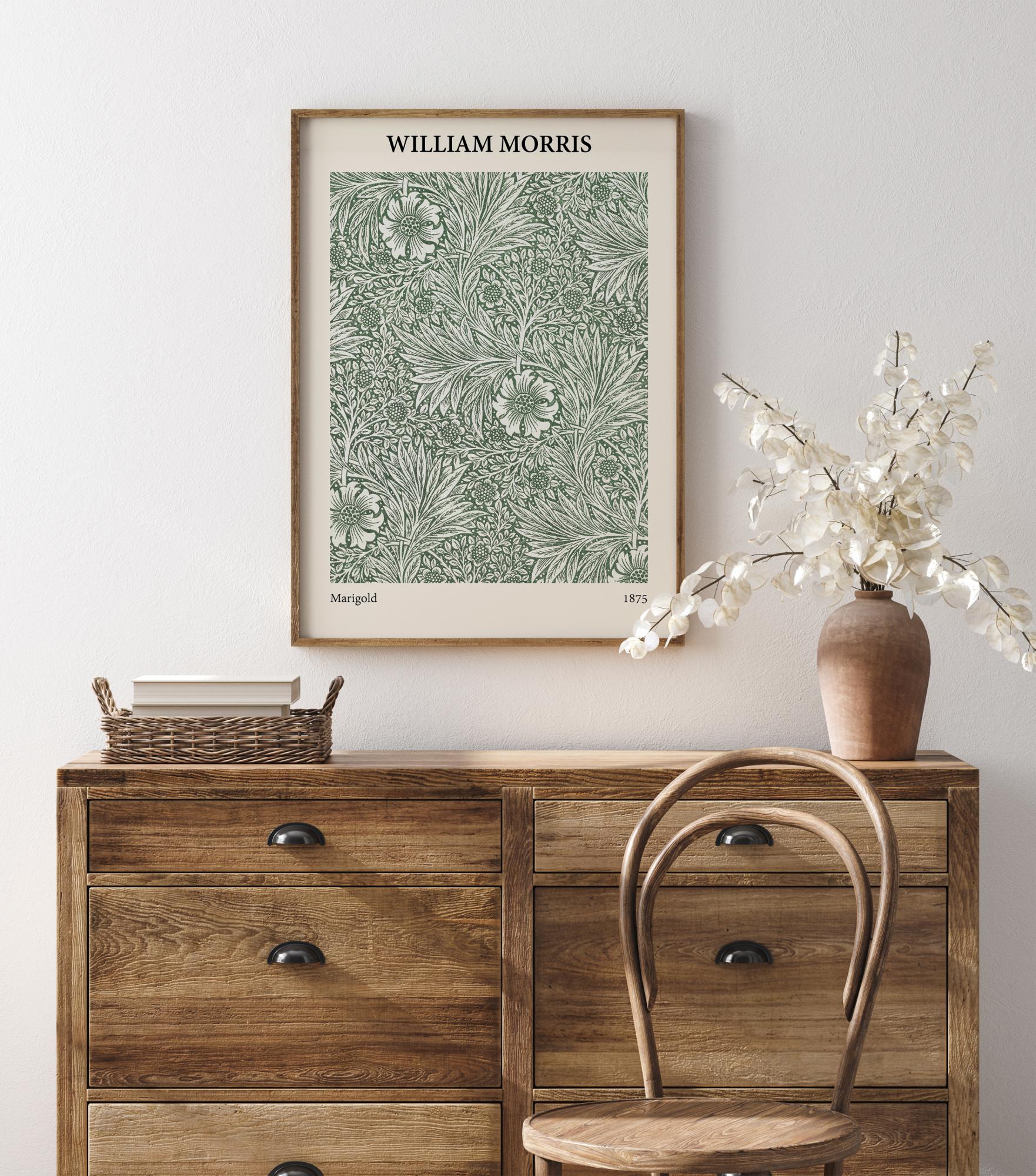 Une affiche classique d'un imprimé William Morris avec des soucis. Ce motif amusant est composé de lignes noires et blanches, les feuilles et les fleurs tourbillonnant sur l'image dans un motif semi-répétitif. Ajoutez-le à une pièce de jardin pour finaliser votre ambiance botanique.