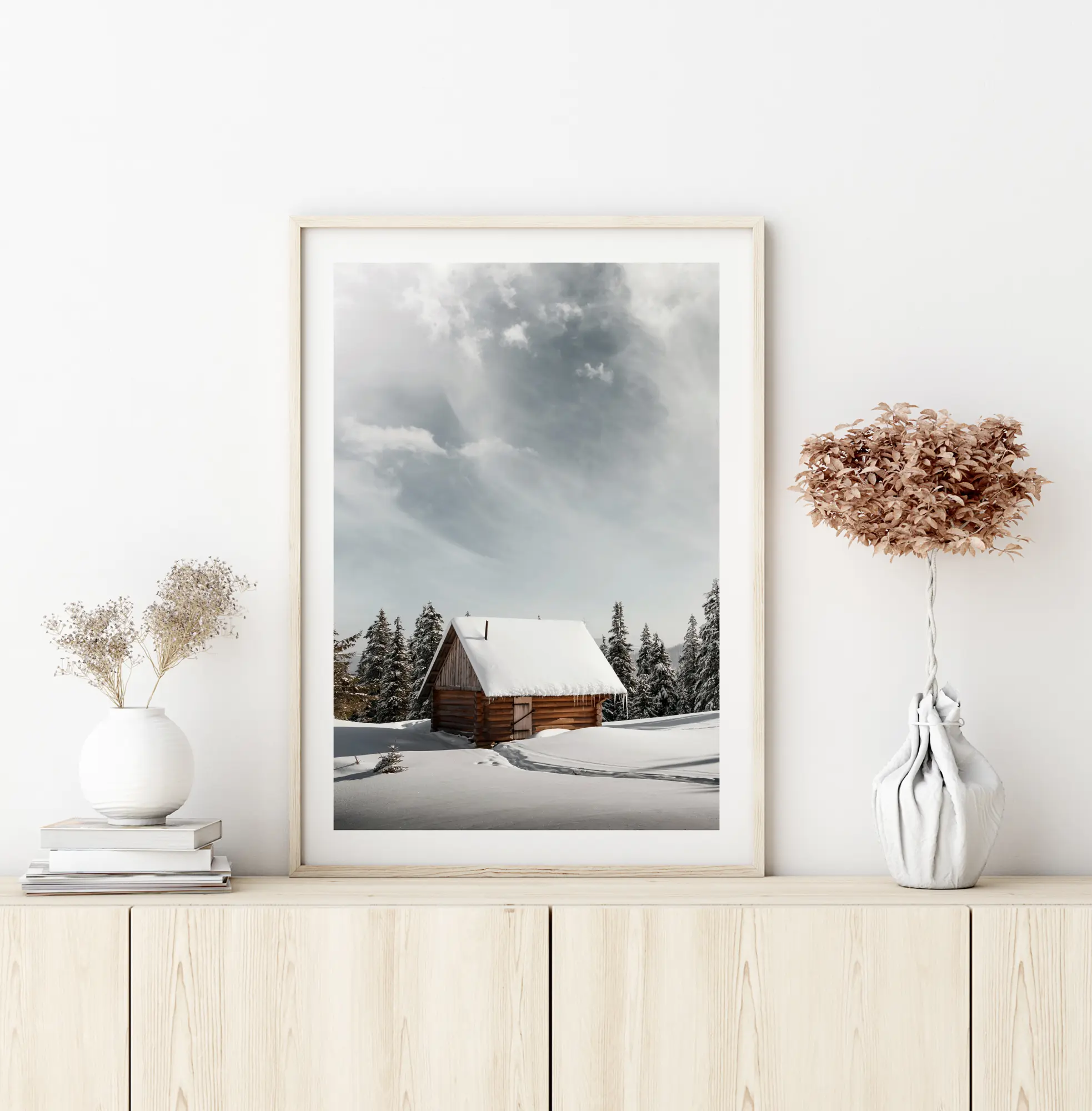 Un poster de Noël représentant une petite cabane en bois dans un paysage enneigé. Une neige douce recouvre le sol et le toit de la cabane dans cette image hivernale. Les sapins sont couverts de neige et des nuages gris foncé remplissent le ciel, prêts à apporter encore plus de neige. Ressentez le froid de l'hiver avec cette élégante affiche.