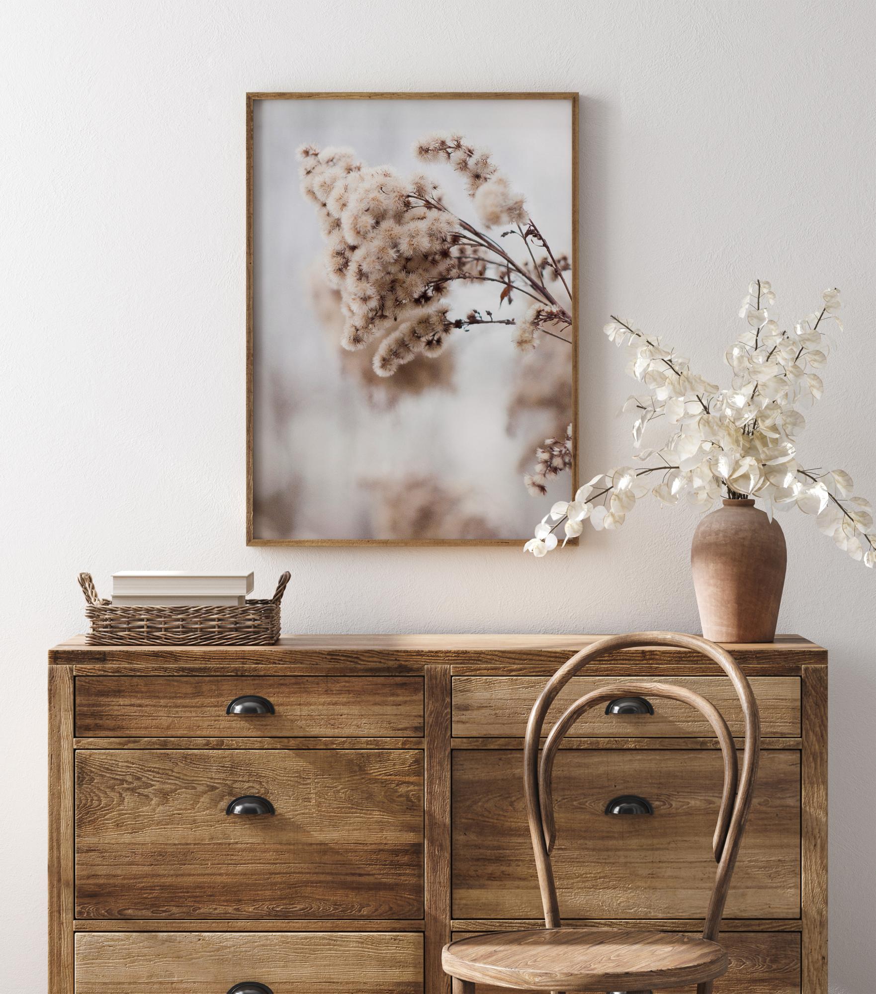 Une affiche florale avec des branches et des boutons de fleurs ronds et doux. Le rose de ces fleurs se détache sur le bleu et le gris doux de l'arrière-plan. Laissez-vous émerveiller par les détails de chacun de ces bourgeons qui s'accrochent à l'image, dans une ambiance hivernale.