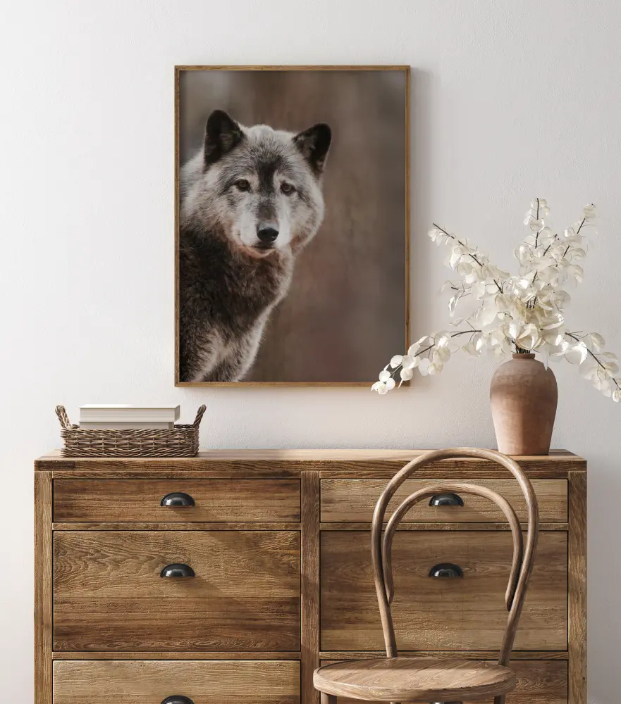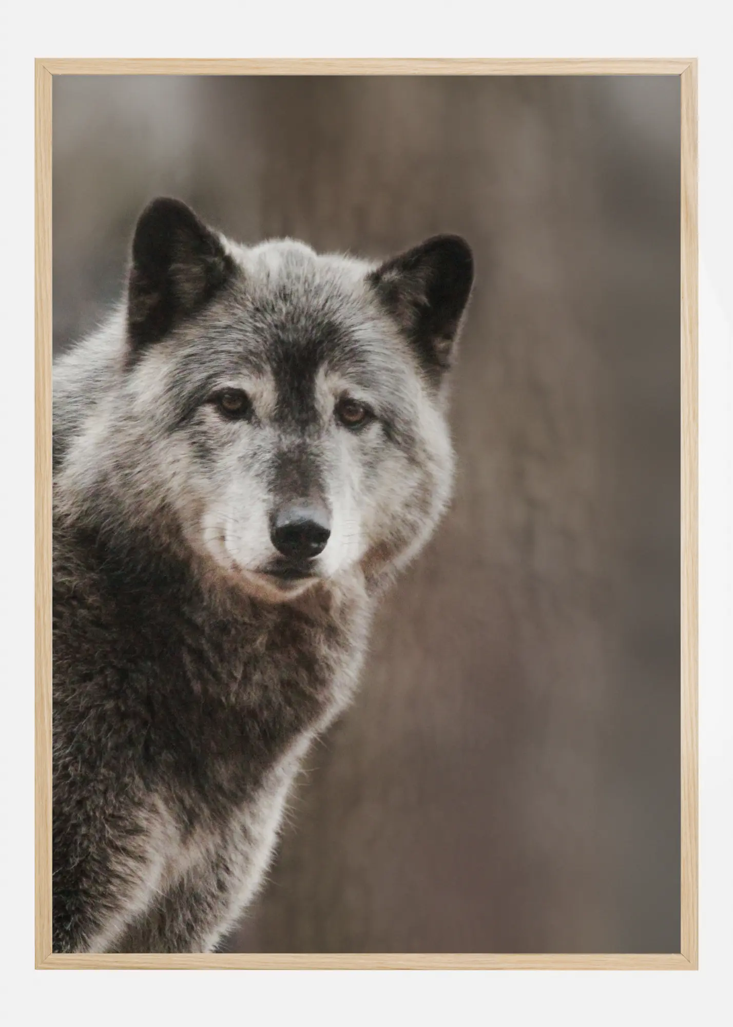 Un poster animalier avec un loup gris fixant l'appareil photo. Le loup a un regard doux, presque comme celui d'un chien. L'arrière-plan est flou et doux, mais crée un sentiment de nature sauvage et de saisons froides imminentes. Ajoutez cette photo à votre mur et rapprochez-vous de la nature.