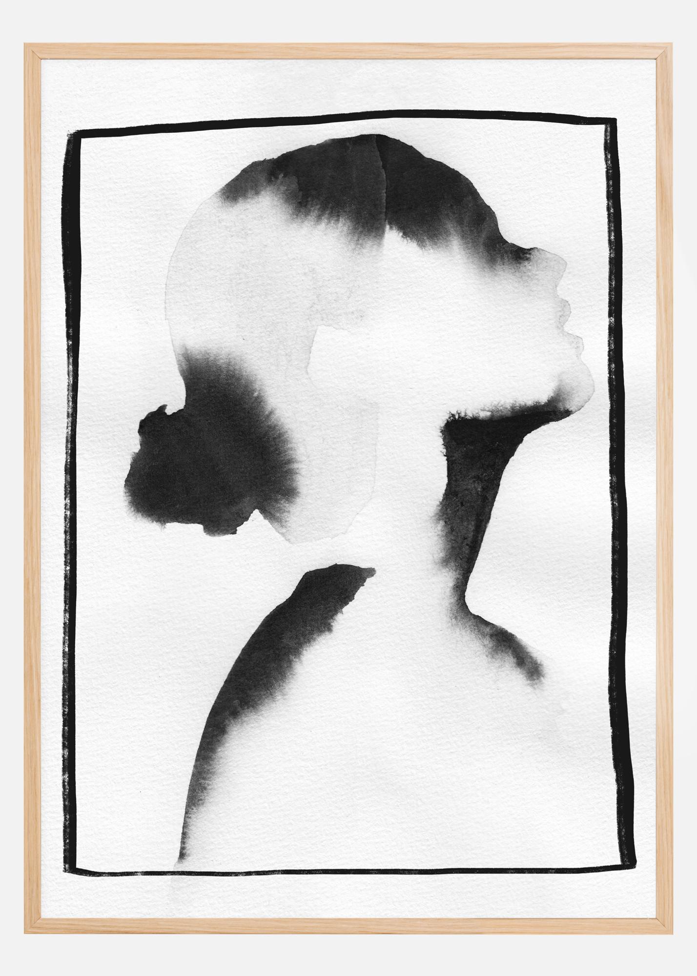 Une affiche d'aquarelle douce du profil d'une femme. Grâce aux techniques de l'aquarelle douce, les cheveux et le visage de la femme sont créés en laissant la peinture s'étaler avec l'eau. Cette technique permet de créer une image en noir et blanc attrayante qui sera superbe sur un fond clair.