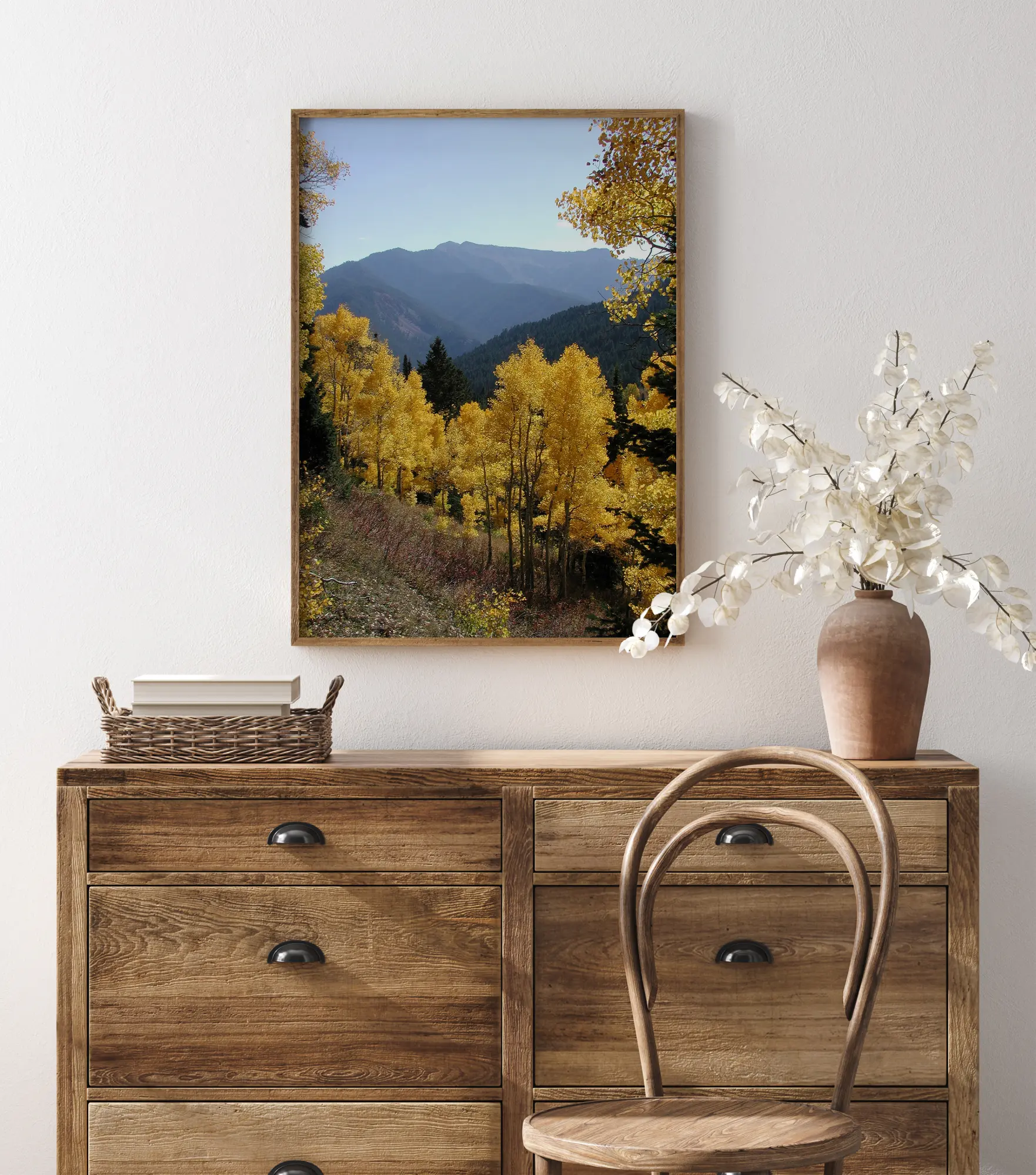 Un paysage lumineux d'arbres jaunes avec une chaîne de montagnes bleues derrière. Les arbres jaunes créent une véritable sensation d'été indien en illuminant cette scène forestière. Grâce à cette image, sentez la brise chaude du début de l'automne qui souffle sur la montagne.