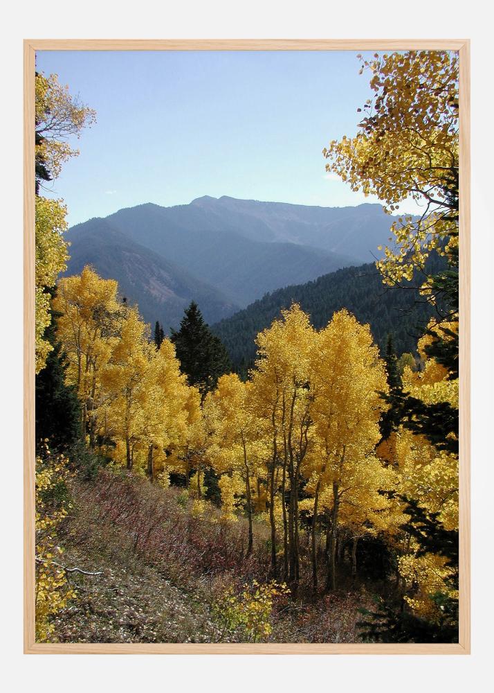 Un paysage lumineux d'arbres jaunes avec une chaîne de montagnes bleues derrière. Les arbres jaunes créent une véritable sensation d'été indien en illuminant cette scène forestière. Grâce à cette image, sentez la brise chaude du début de l'automne qui souffle sur la montagne.