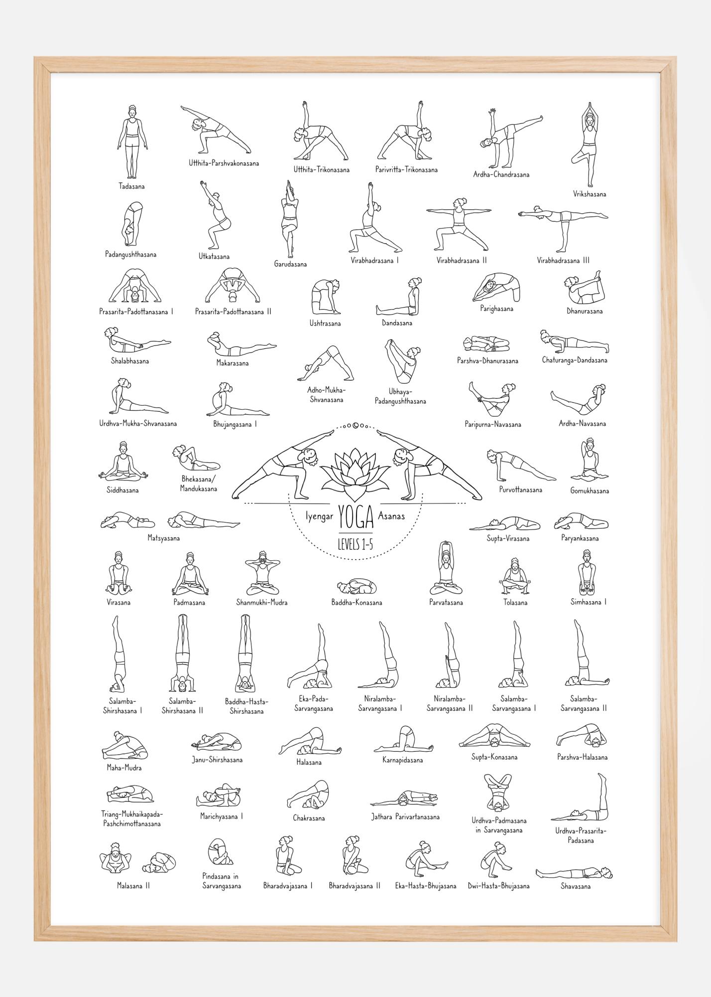 La partie centrale du poster est dédiée aux Iyengar Yoga Asanas pour les niveaux 1-5, indiquant une progression dans la pratique. Cette impression est non seulement fonctionnelle mais aussi esthétiquement attrayante, et s'intègre parfaitement dans un studio de yoga, une salle de sport à domicile, ou comme source d'inspiration dans un coin détente de la maison. Son design minimaliste en noir et blanc la rend compatible avec une variété de styles de décoration, tout en diffusant une sensation de calme et de concentration.