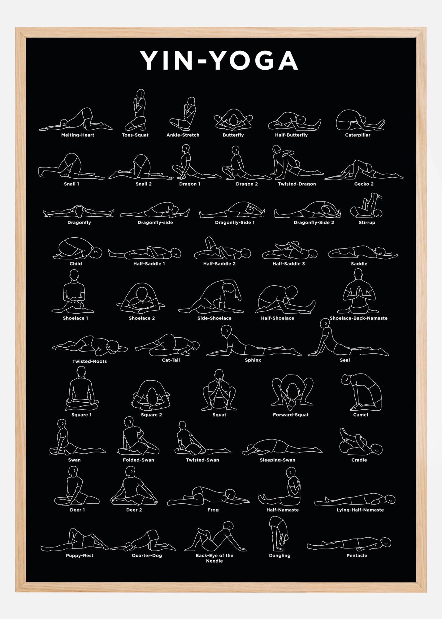 Une affiche utile, avec les différentes poses de yoga que vous pouvez faire. Jetez un coup d'œil à cette affiche noire où chaque pose de yin yoga est représentée par une simple figure blanche. Apprenez facilement les différentes poses grâce à la petite silhouette qui vous montre comment les réaliser. Soyez souple cette année et commencez à vous étirer grâce à ce poster !