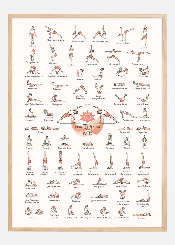Ce poster coloré et inspirant illustre une large gamme de Iyengar Yoga Asanas pour les niveaux 1-5, présentée avec un design vif et engageant. Chaque asana est clairement représenté avec une illustration détaillée et colorée, qui met en valeur sa forme et fournit une compréhension visuelle immédiate de chaque pose. Les noms des positions sont indiqués à côté de chaque illustration, en sanskrit, ce qui fait de ce poster une ressource précieuse et pédagogique.