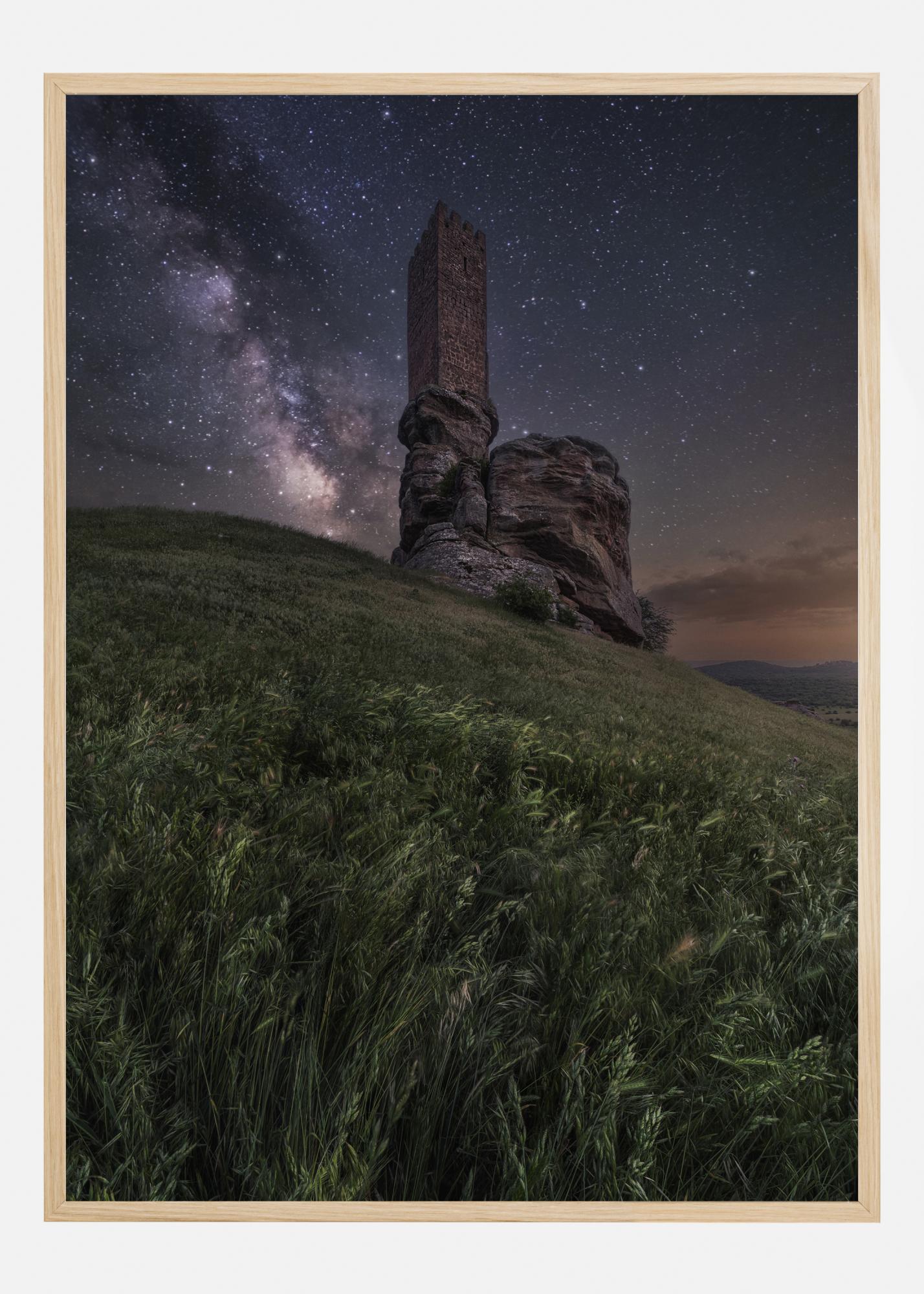 Une magnifique affiche du château de Zafra pendant la nuit. Levez les yeux vers cette vieille structure en pierre depuis le bas d'une colline herbeuse. La tourelle s'élève jusqu'au ciel nocturne où la Voie lactée se dessine en arc de cercle. Cette photo sera magnifique sur n'importe quel mur de votre maison et ajoutera une touche de magie.