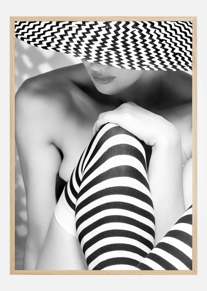 Un portrait géométrique d'une femme portant un chapeau à motifs et des bas à rayures. Elle se penche en avant, une main sur son genou. Son visage est masqué par le motif du chapeau dans cette image qui attire l'attention. Associez-la à un mur coloré et regardez ces motifs exploser.