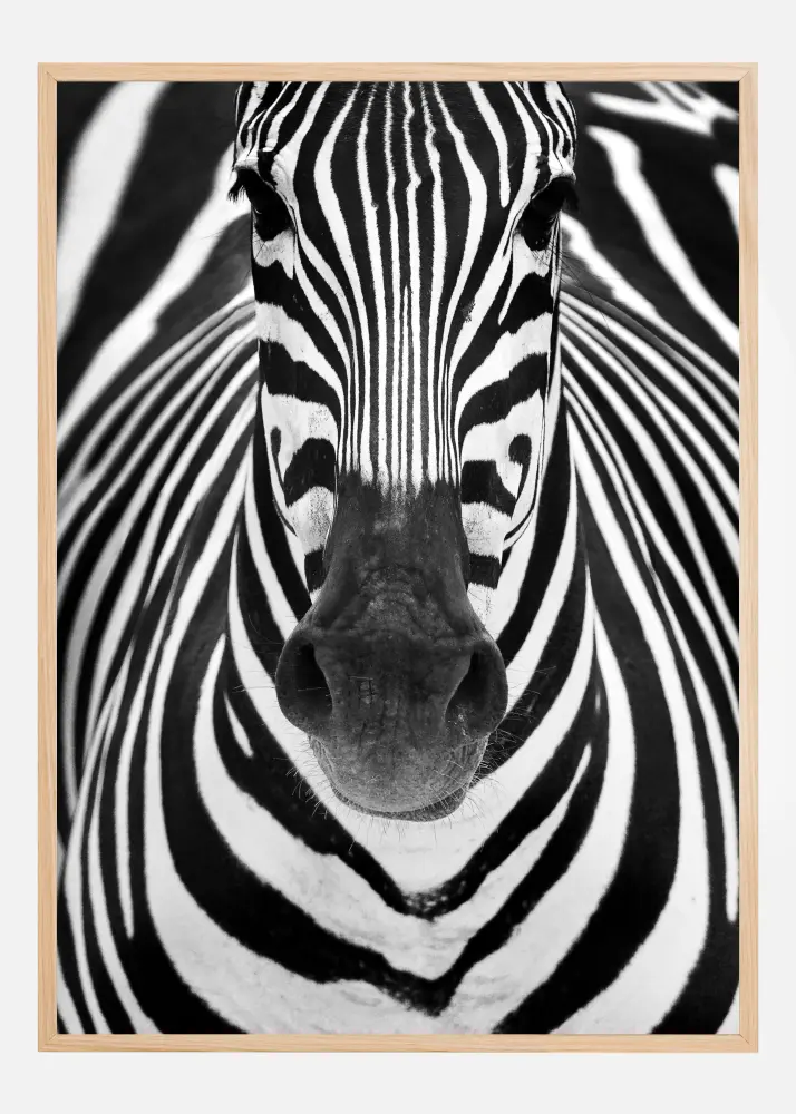 Une affiche animalière étonnante d'un zèbre aux lignes géométriques faisant face à la caméra. Ajoutez des formes géométriques fortes à votre intérieur. Associez ce superbe poster à un mur de couleur vive pour une impression d'art abstrait.
