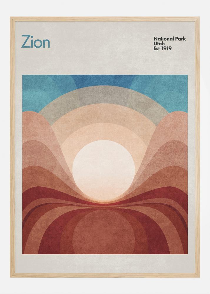 Cette affiche capture la nature majestueuse du parc national de Zion avec des couches stylisées de paysage créant une interprétation abstraite des formations rocheuses emblématiques du parc et de ses vues panoramiques. Le texte "Zion National Park Utah Est 1919" offre un contexte historique et rend hommage à l'héritage du parc en tant que trésor national depuis le début du XXe siècle.