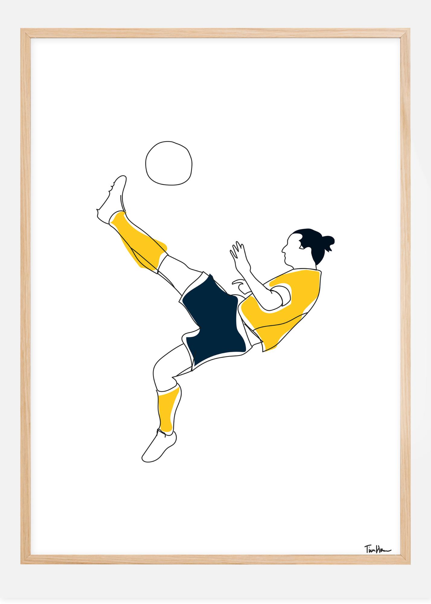 Une affiche de football avec une image stylisée de Zlatan Ibrahimovic tapant dans un ballon. Le joueur porte un haut et des chaussettes jaunes avec un short bleu marine. Penchée en arrière, sa jambe donne un coup de pied en l'air et le ballon s'envole. Célébrez votre amour du football avec ce design simple et joli.